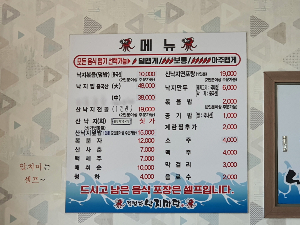 보령 맛집 낙지마당의 가격은 낙지볶음 기준으로 1인당 1만 원의 가격을 보여주고 있다. 또한 산낙지 전문점답게 낙지찜이나 낙지전골 그리고 산낙지와 연포탕 등 산낙지로 가능한 요리는 모두 가지고 있는 맛을 가지고 있다. 전체적으로 평가가 좋은 편이며 모든음식의 맵기는 선택이 가능한데 보통 맛은 신라면보다 조금 더 매운 맛이라고 생각하면 되기에 고추 2개 = 신라면 정도 수준이라고 생각하면 된다.