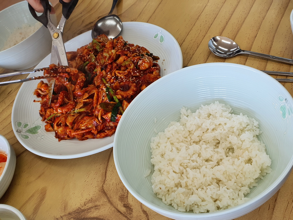 기본 반찬으로 주는 콩나물과 낚지볶음을 어느정도 넣어서 잘 비벼서 먹으면 매콤한 맛을 느낄 수 있는데 오랜만에 기분 좋아지는 낙지를 맛볼 수가 있다. 콩나물이 싫은 사람이라도 낙지만 넣고 비벼서 먹어도 꽤 맛있고 한 번에 다 비벼서 먹기 보다는 나누어서 비벼서 먹는 것을 추천한다. 약간 맵다고 느껴질때 콩나물을 살짝 넣고 미역 냉국과 함께 먹으면 그 조화가 좋다.
