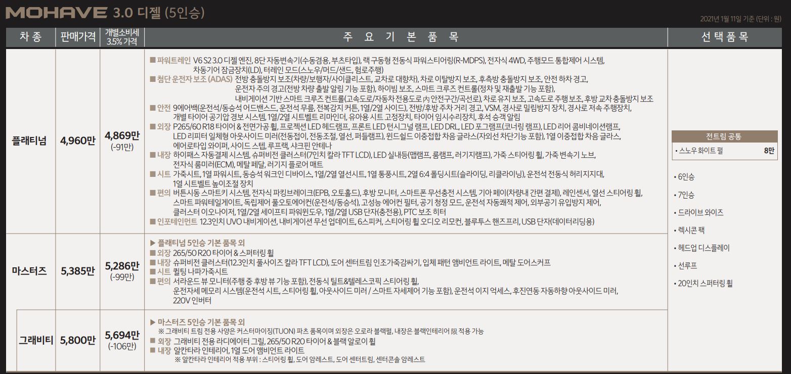 모하비 더 마스터 2021년식의 가격은 개소세 미적용으로 4,960만 원부터 시작하여 마스터즈 5,385만 원 / 그래비티 5,800만 원의 가격을 가지고 있으며 모든 옵션을 다 적용할 경우 6,000만 원정도의 가격까지 올라갈 수 있는 금액대를 보여줄 예정이다.