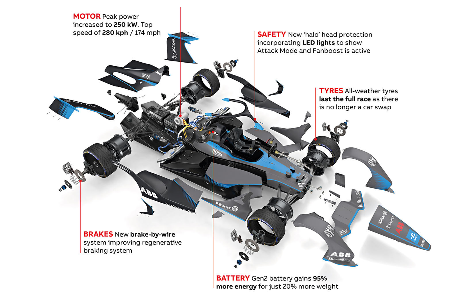 포뮬러 E 전기 모터를 사용하고 있기에 굉장히 빠르다고 생각할 수 있다. 하지만 2세대 레이스카 EVO 모델 기준으로 최고 속력 280km/h로 규정상으로는 포뮬러 1보다 아랫등급인 F3와 비슷한 퍼포먼스를 내야한다고 규정되어 있다. 또한 차량 최고출력은 250kW로 정해져있으며 차량 무게는 드라이버 포함하여 900kg이다. F1 포뮬러 원의 최고속도는 370km/h에 비하면 굉장히 낮은 속도이며 이는 F3 / F4 수준 밖에 안되지만 정지 상태에서 시속 100km/h까지 움직이는데 2.8초 수준으로 굉장히 빠른 수준이다. 참고로 F1의 제로백은 2.6초이내로 더 빠르다.