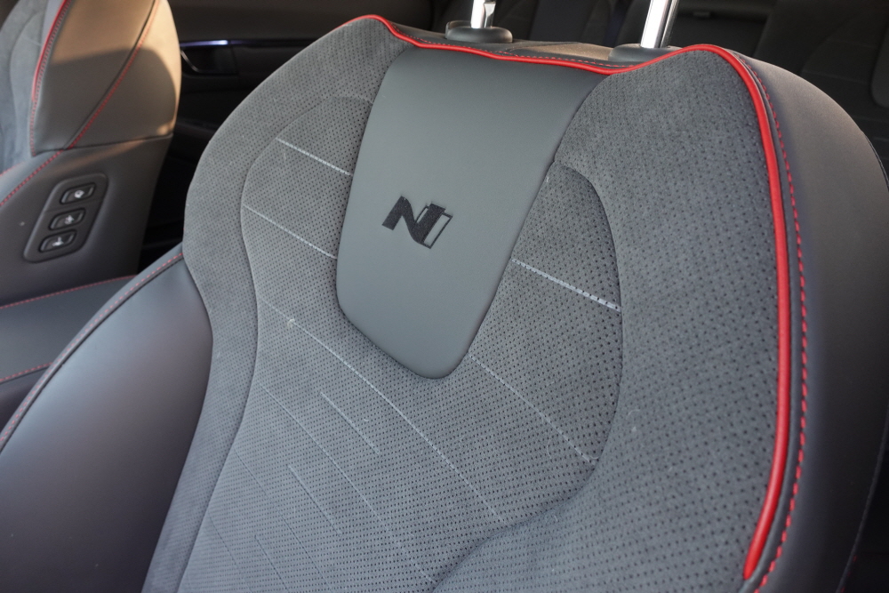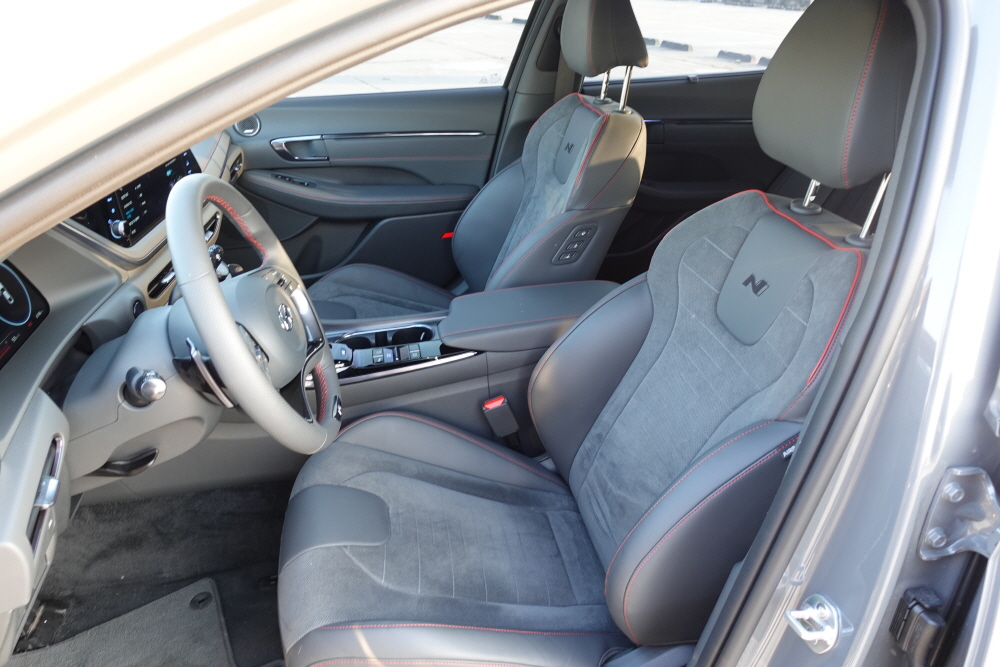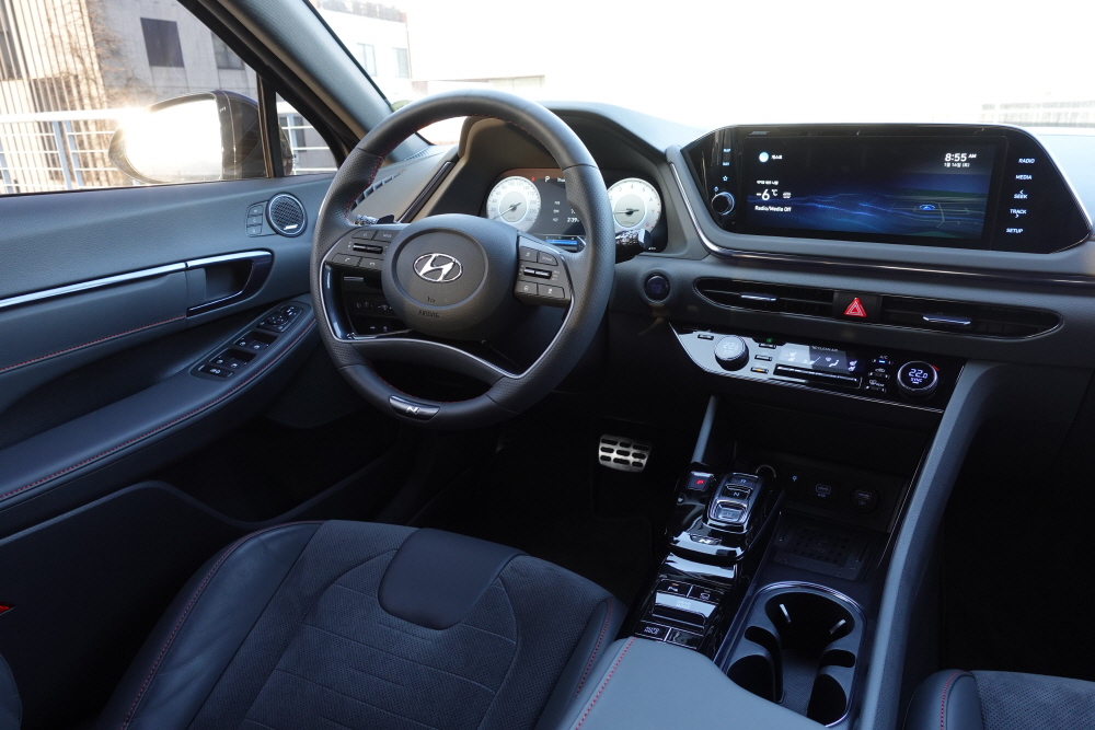 쏘나타 N라인의 실내에서 가장 눈에 띄는 부분은 바로 N 전용 버킷 스타일의 시트가 적용되었다는 점이다. 다크 그레이 컬러와 레드 스티치를 포인트로 주는 시트는 중형 세단에서 스포츠 세단에 느낌을 주기에 충분하다. 여기에 스웨이드와 나파가죽은 알칸타라 소재와 같은 느낌을 주고 있으며 기능성으로 운전석 8 Way 전동 시트와 자세 메모리 시스템 그리고 통풍과 열선 시트까지 적용된다. 그 외 다른 점이 있다면 액티브 사운드 디자인 메뉴가 추가 되었다는 점과 버튼식 변속기 하단에 N 엠블럼이 적용되었다는 점인데 타 브랜드와 자꾸 비교해서 그렇지만 하이그로시 부분을 다른 재질로만 변경하더라도 좀 더 다른 느낌을 주지 않았을까??