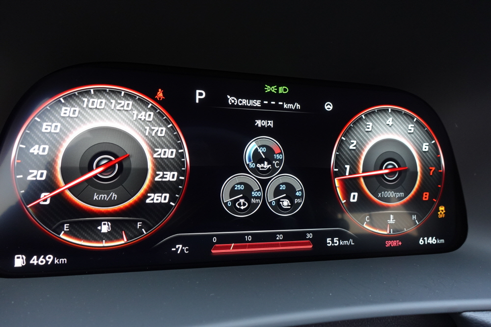 계기판에서는 N 로고를 만나볼 수가 없으며 다른 점이 있다면 게이지가 추가 되었다는 점이다. 유온과 토크 그리고 터빈 압력을 표시가 되어 있지만 실제 스포츠 주행에서 크게 도움되지 않고 그냥 기본 모델과 다른 점을 강조하기 위함으로 보인다. 기존 아날로그 계기판이라면 추가로 찍어내고 금형을 바꿔야되지만 풀 LCD 디지털 계기판에서 디자인을 변경하는 것은 어려운 일이 아닐텐데 다소 아쉬운 느낌을 준다.