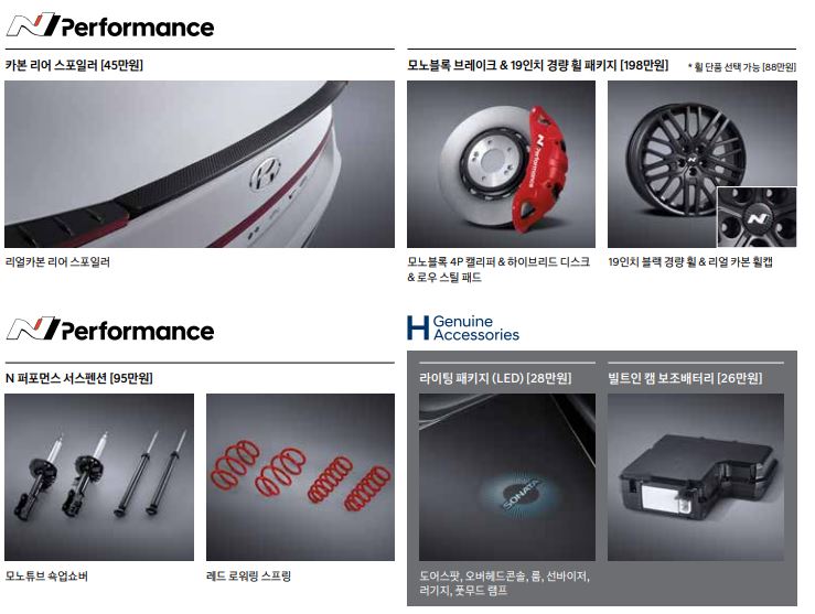 풀옵션 3,767만 원 (개별 소비세 3.5% 적용) 가격에 N 퍼포먼스 파츠로 리어 카본 스포일러 45만 원/ 모노블럭 브레이크와 경량 휠 패키지 198만 원, N 퍼포먼스 서스펜션 95만 원, 라이팅 패키지 28만 원, 빌트인 캠 26만 원까지 포함한다면 진정한 풀 옵션 가격은 4,159만 원으로 깡통 모델 가격 3,050만 원 (개별 소비세 3.5%적용)과 비교한다면 1,109만 원의 가격 차이를 보여준다.