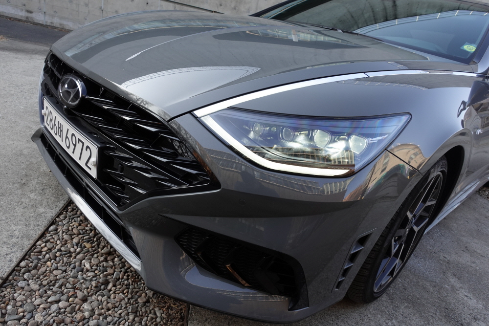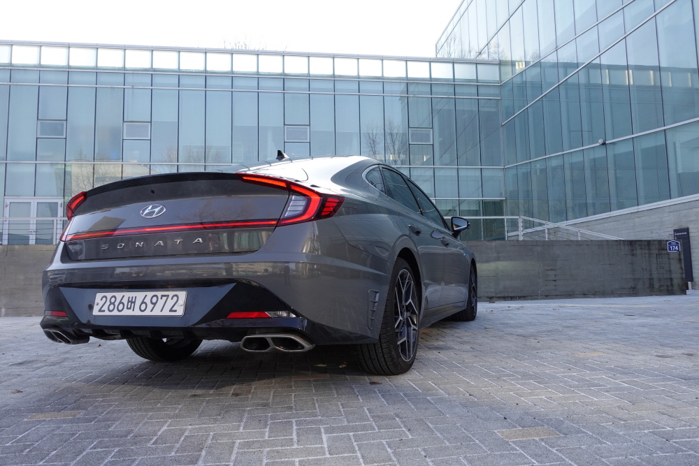 쏘나타 N라인 모델은 DN8 세대에서 표현하고 싶은 거의 모든 것을 표현했다. (물론 쏘나타 N 모델이 나오지 않는다면...) 기본적으로 센슈어스 스포티니스 컨셉 디자인에 N 브랜드의 고성능 이미지를 잘 적용했다는 것이 특징이다. 파라메트릭 쥬얼 패턴의 그릴 그리고 3개의 인테이크 홀이 적용된 N라인 전용 범퍼는 기존 2.0 가솔린 기본 모델과 비교한다면 훨씬 디자인에 안정감과 좀 있어보이는 느낌을 충분히 준다. 또한 프론트 펜더와 그릴에는 N Line 뱃지를 적용하여 차별성을 주고 있으며 리어 디자인에는 N Line 뱃지를 만나볼 없다. 하지만 리어 디자인은 듀얼 라인아 듀얼 팁 머플러를 적용하고 있어 고성능에 이미지를 선사하고 있다.