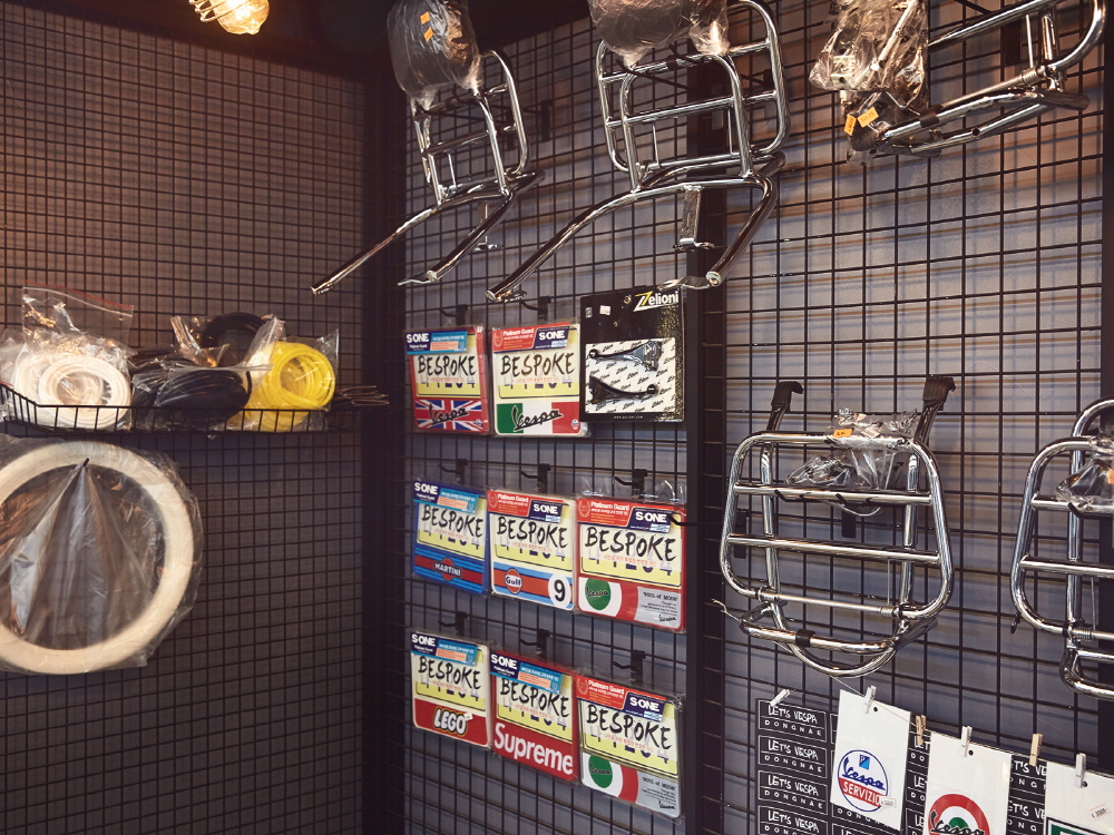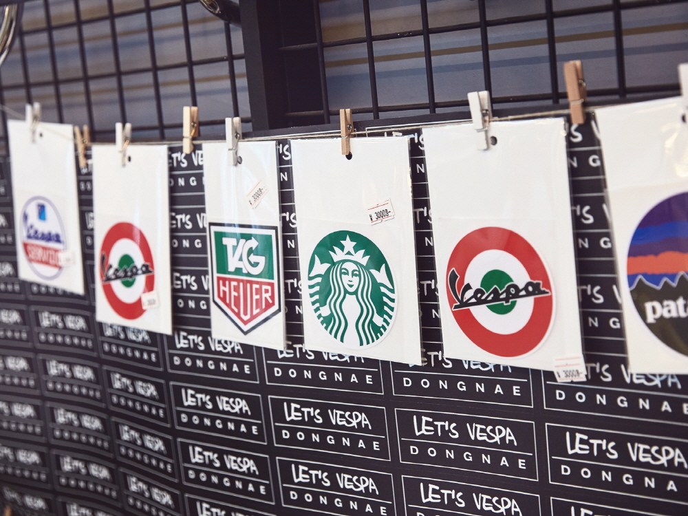 부산 베스파 동래지점에는 이탈리아 클래식 바이크에 어울리는 기어 (Gear)들도 구입할 수 있으며 나만의 바이크를 꾸밀 수 있는 다양한 스티커와 파츠들을 구입할 수 있으며 원한다면 이 곳에서 장착까지도 한 번에 가능하다.