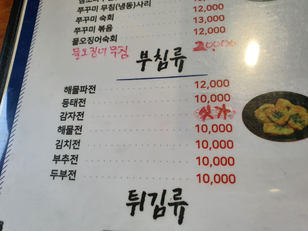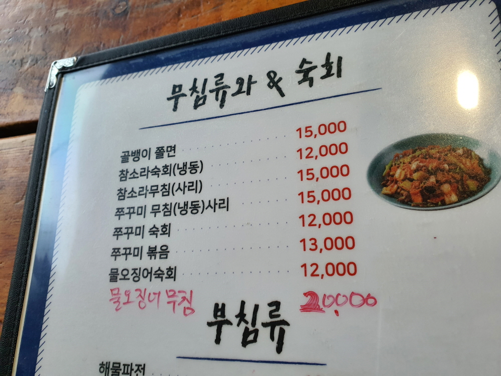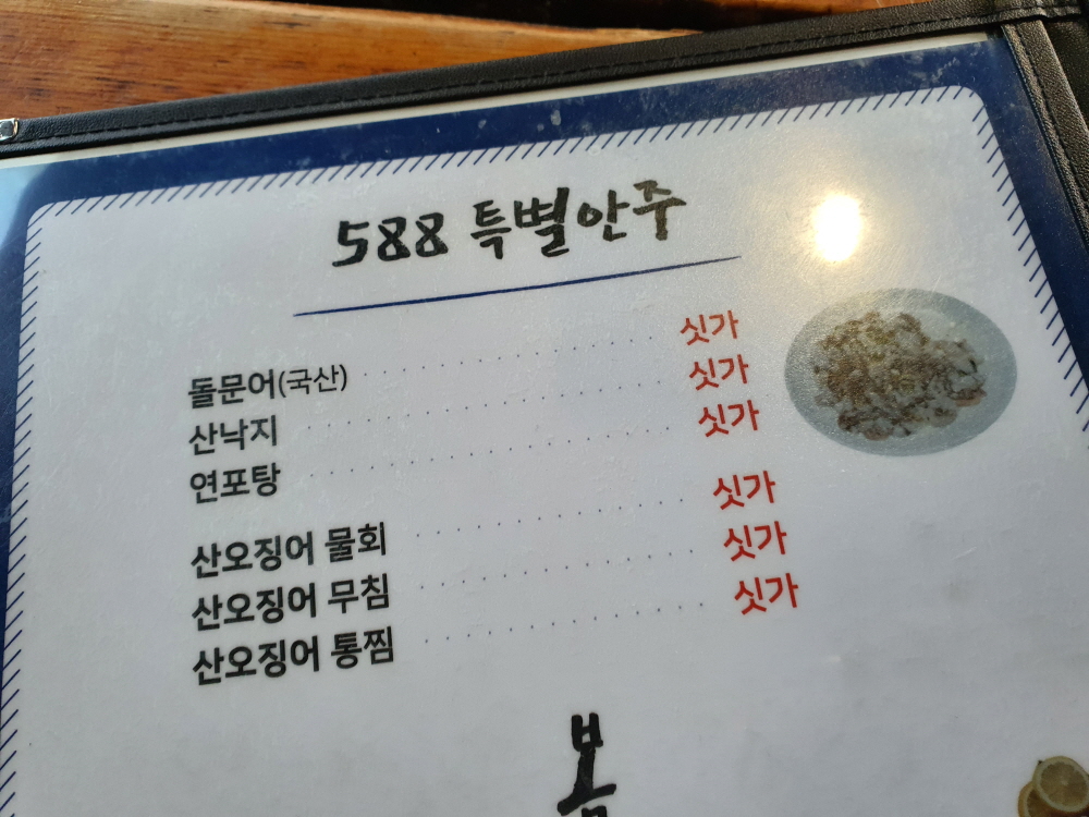 이 곳의 해산물은 싯가인 편이다. 물론 메뉴판은 존재하지만 계절에 따라 혹은 해산물의 상태에 따라서 안주가 있을 수도 없을 수도 있다. 사실 이 날은 왠지 석화가 땡기는 그런 날이였지만 코로나19로 인하여 손님도 줄고 영업 시간도 짧아 어쩔 수 없이 신선한 해물을 많이 가져다 둘 수 없으신 사장님의 마음을 이해하고 다른 메뉴를 주문했다.