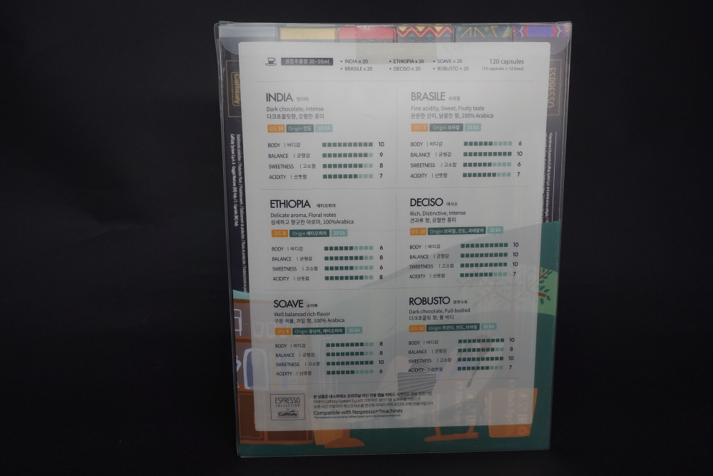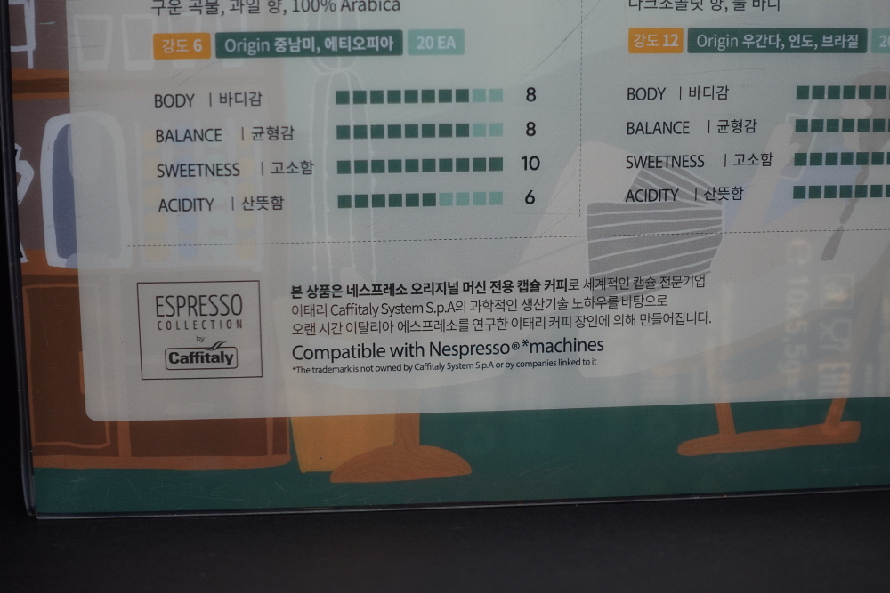 네스프레소 캡슐머신을 구입하면 처음에 다양한 맛을 선택할 수 있어 선택 장애가 오지만 나중에는 왠지 모르게 그 녀석이 그 녀석 같고 아이스로 마시면 내가 무슨 캡슐을 먹는지 모르겠다면 코스트코 커피캡슐은 좋은 대안이 될지도 모르겠다. 카피탈리 제품은 이탈리아 브랜드로 네스프레소 호환캡슐로 굉장히 유명한 회사이다. 이 회사에서는 총 6가지 맛을 세트로 판매한다.