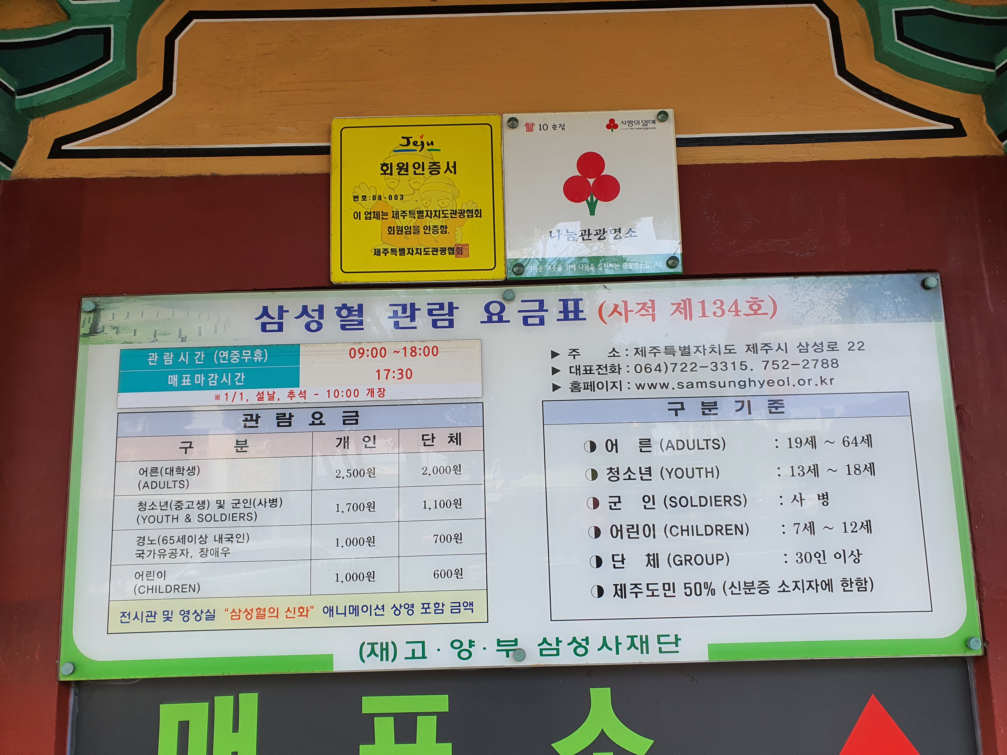 삼성혈의 입장료는 성인 2,500원 어린이 1,000원으로 전시관 및 영상실의 삼성혈의 신화 애니메이션 상영 포함 금액입니다. 오전 9시부터 오후 18시까지 운영되고 있으며 이 근처에 고기국수 집이 많기 때문에 아침에 식사하시고 산책하는 곳으로 괜찮은 곳입니다.