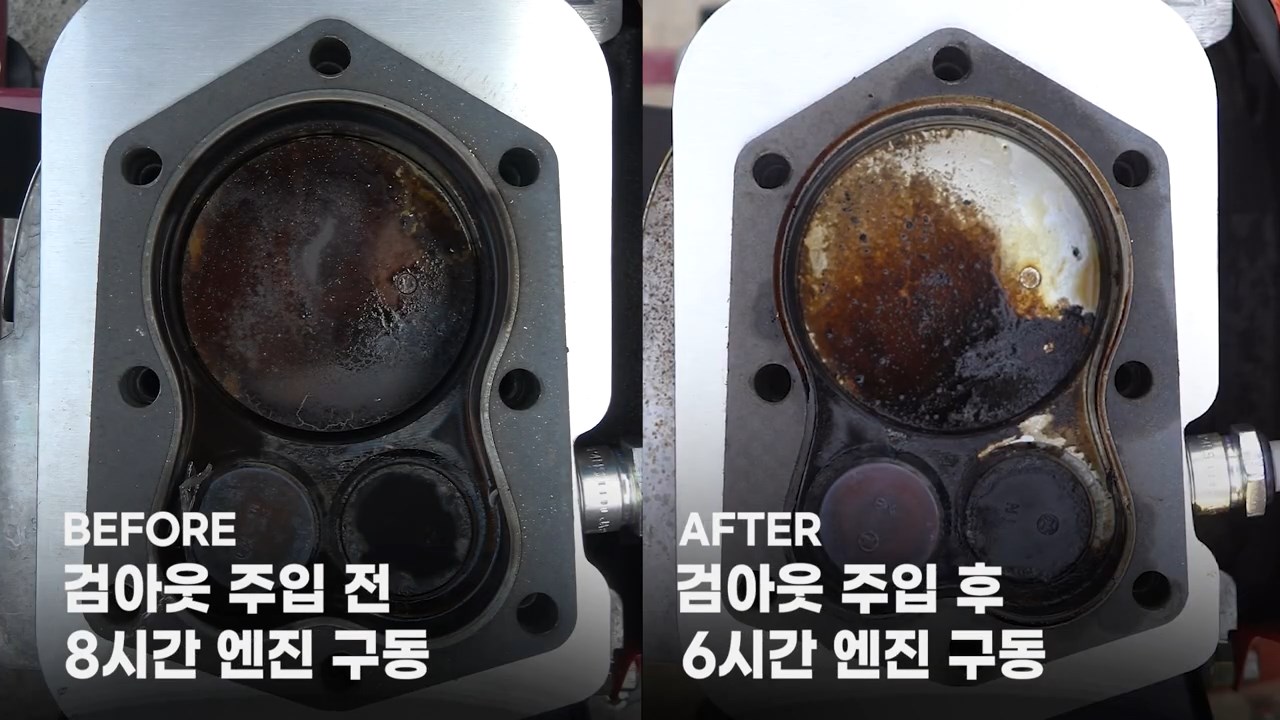 실험 전 깨끗했던 엔진 내부는 단 8시간만에 까맣게 그으름과 카본 슬러지들이 쌓인것을 볼 수가 있었다.