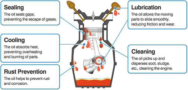엔진 오일의 주요 역할은 부품이 작동하면서 생기는 마찰을 줄이는 윤활유 역할을 하는 것이다. 윤활유 역할이 없으면 엔진이 빠르게 손상이 되기 때문에 엔진 오일을 사용함으로 인해 수리 및 유지 관리 비용이 줄어들 수 있다.