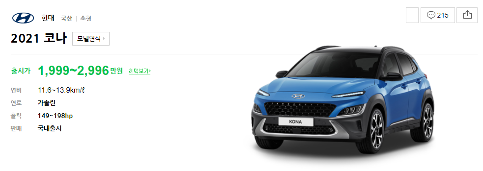 현대 소형차 코나는 전기를 이용하는 하이브리드 모델과 현대차에서 만든 준고성능 모델 ‘N라인’ 모델도 있다.