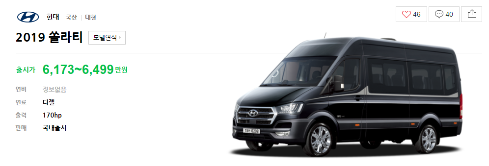 쏠라티는 2.5디젤 엔진을 사용하며 최대출력 170hp로 출시가는 15인승이 6,173~6,499만원, 16인승이 6,354만원이다.