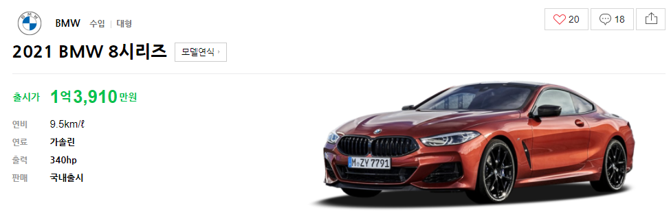 가솔린 연료를 사용하는 8시리즈 모델 840i xDrive는 최대출력 340hp, 연비 9.5km/ℓ로 출시가 1억3,910만원이다.