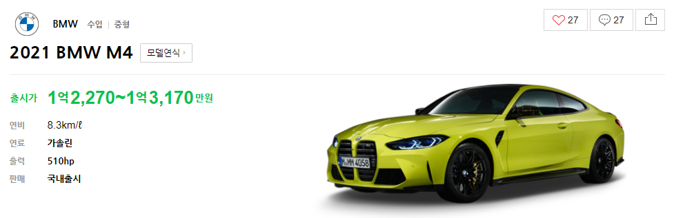 M4는 최대출력 540hp, 연비 8.3km/ℓ로 출시가 1억2,270~1억3,170만원이다.