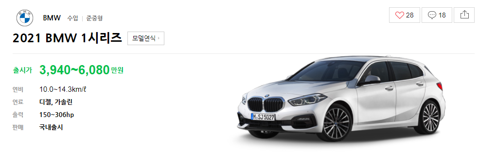 120i 모델은 최대출력 192hp, 연비 11.0km/ℓ로 출시가 4,000만원~4,600만원 이고,