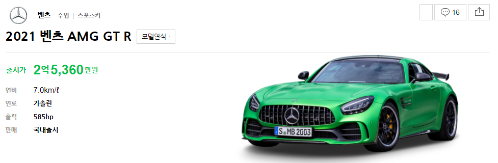 AMG GT R은 4.0 가솔린 엔진을 사용하며, V8 트윈터보 방식, 후륜구동 방식이 탑재 되어있다. 또 최대출력은 585hp, 연비 7.0km/ ℓ로 출시가 2억 5,360만원이다.