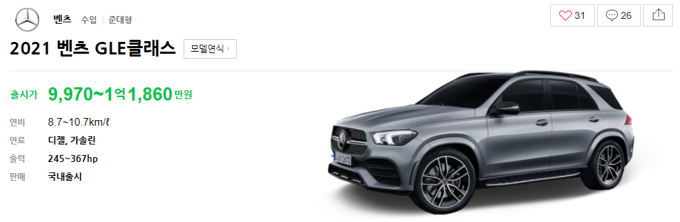 모델명은 GLE350e 4MATIC으로 I4직분사 싱글터보 엔진형식이며, 풀타임 4륜구동, 자동9단 변속기가 적용된다. 또 최대출력 211hp 연비 9.0km/ℓ로 출시가 1억 1,460만원이다.