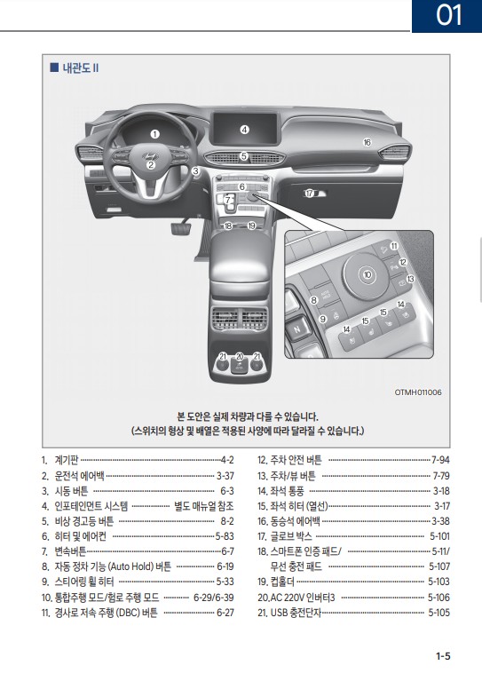 좌석 조절 방법, 안전벨트, 에어백과 같은 안전장치와 관련된 내용들이 정리된 내용이다. 올바른 벨트 사용방법, 어린이 보조시트 이용 방법, 에어백 장치의 구성 및 기능에 대해 자세히 설명 되어 있어 안전을 위해 꼭 숙지해 두는 것이 좋다. 오른쪽 사진은 승객 구분 시스템(OCS)에 대한 주의 사항인데 엉덩이 보호대나 두꺼운 옷을 입는 우, 두꺼운 쿠션 시트 액세서리를 사용하는 경우, 다량의 액체를 쏟았을 경우 시스템이 오작동해 에어백 사용에 문제를 일으킬 수 있다고 한다.