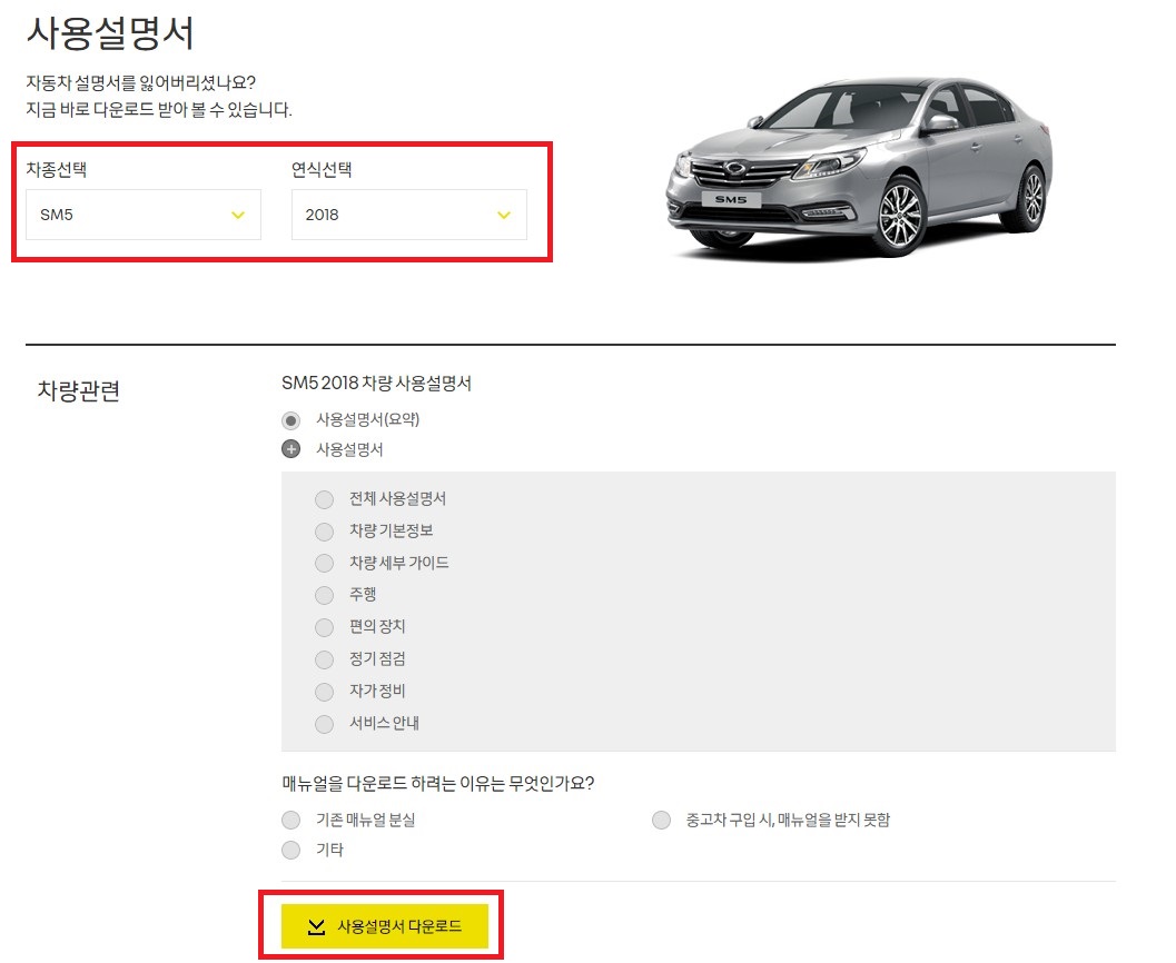 그러면 이렇게 차종과 연식을 선택하고, 원하는 내용을 골라서 다운로드 할 수 있도록 되어있다.