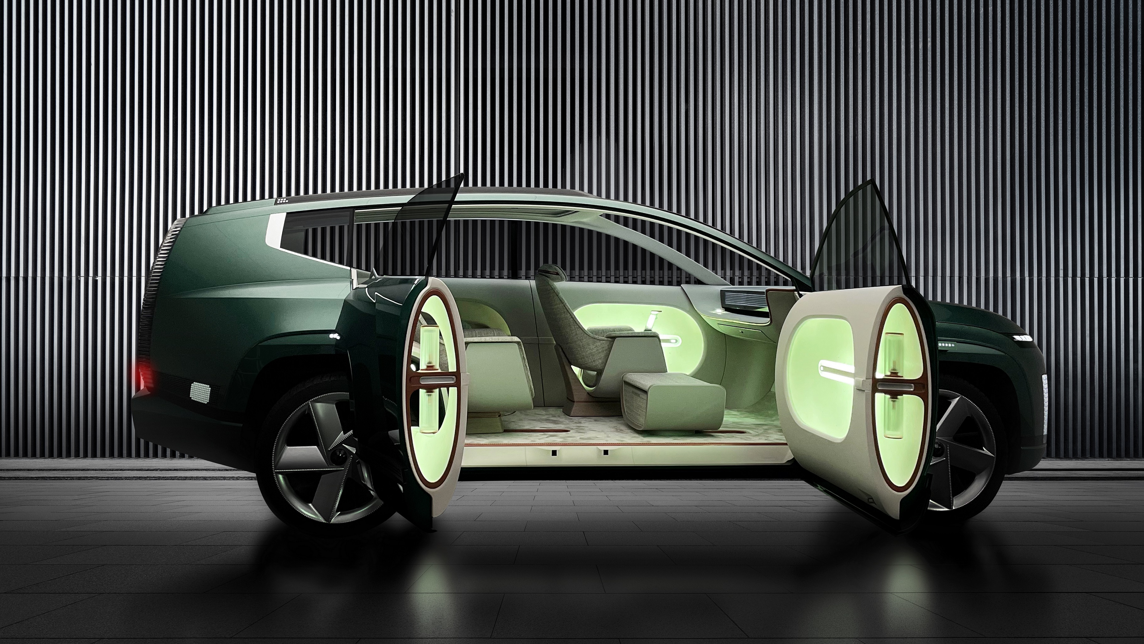 시트의 활용도도 이색적이다. 2개의 스위블링 라운지 체어는 180도 회전과 앞뒤 이동이 가능하며, 1개의 라운지 벤치 시트는 운전모드, 자율주행 모드 등 상황에 따라 자유롭게 배열 변형이 가능하다. 또 27인치 디스플레이가 장착된 이동식 콘솔인 ‘유니버셜 아일랜드’는 가전 제품처럼 디자인 되어 탑승자가 집처럼 아늑한 느낌으로 이용할 수 있도록 분위기를 조성한다. 또 77인친 비전루프 디스플레이, 슈즈 케어 공간 및 미니 냉장고 등이 더욱 쾌적한 실내 공간 이용을 하도록 도와준다.