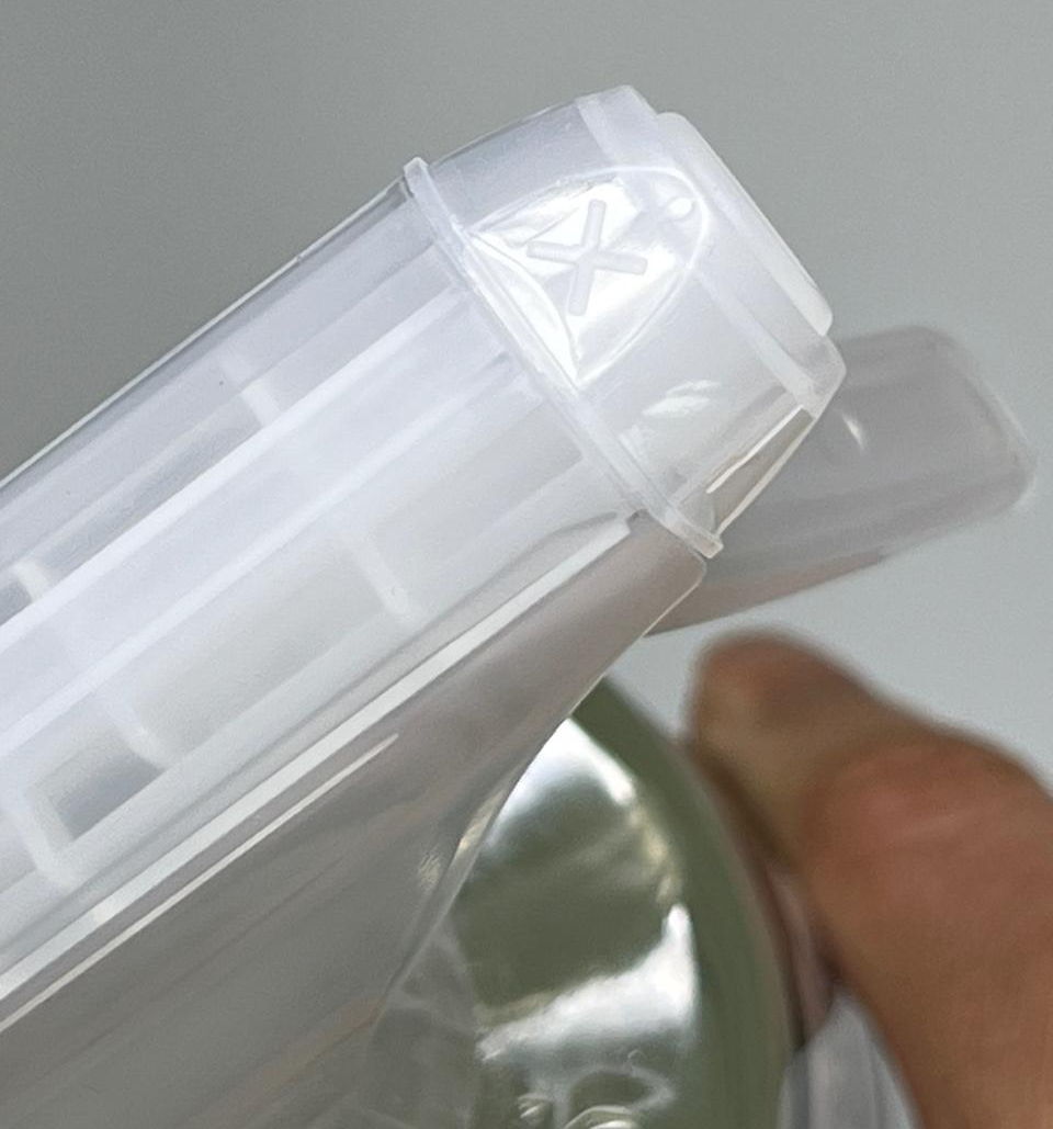 스프레이 헤드 끝을 보면 처음에 왼쪽처럼 X모양이 위로 오게 되어 있습니다. 오른쪽처럼 분사 모양이 위로 오도록 돌린 후 사용해주세요.