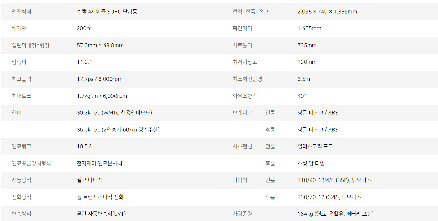 배기량 | 125cc | 축간거리 | 1,465mm |