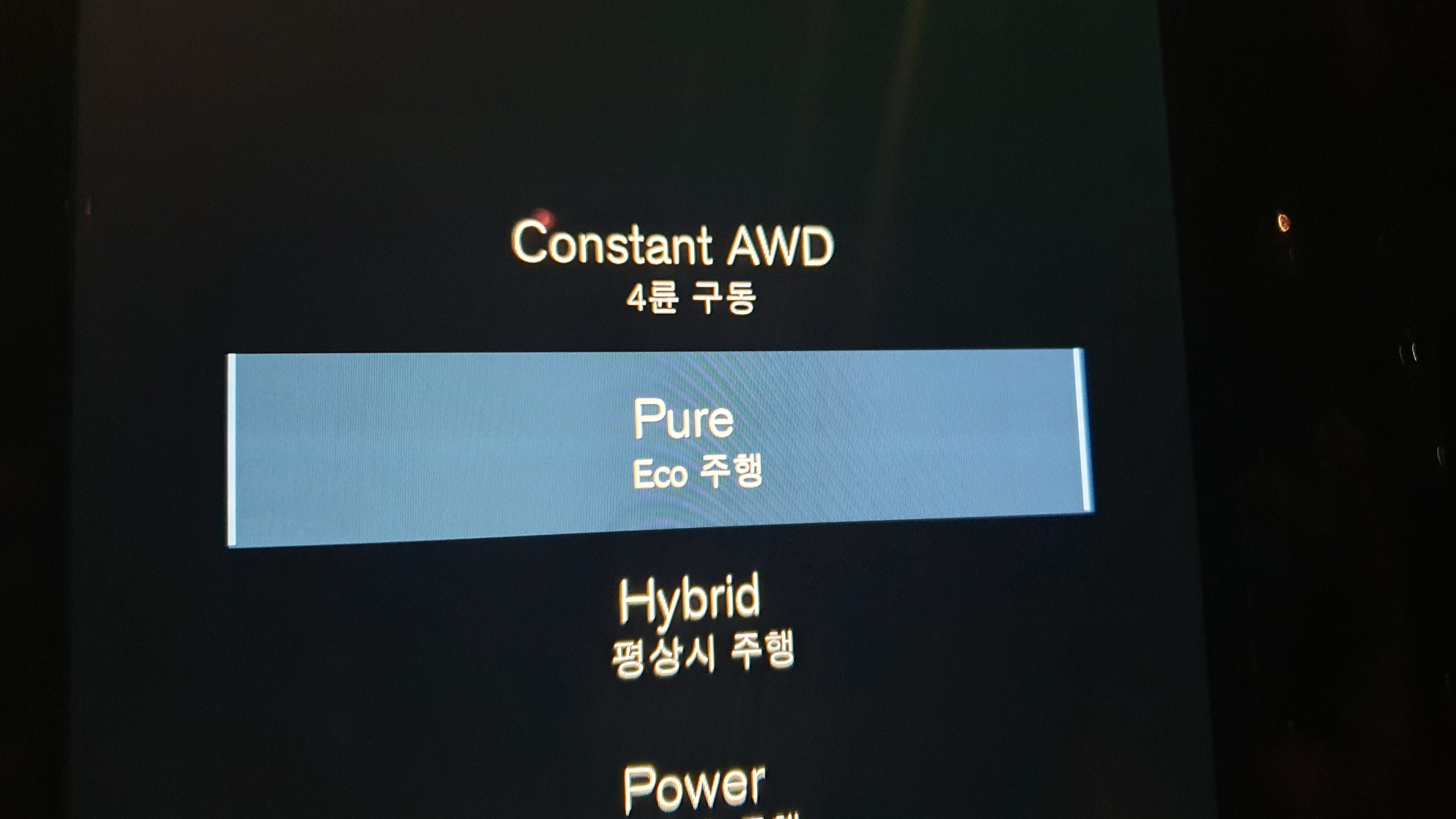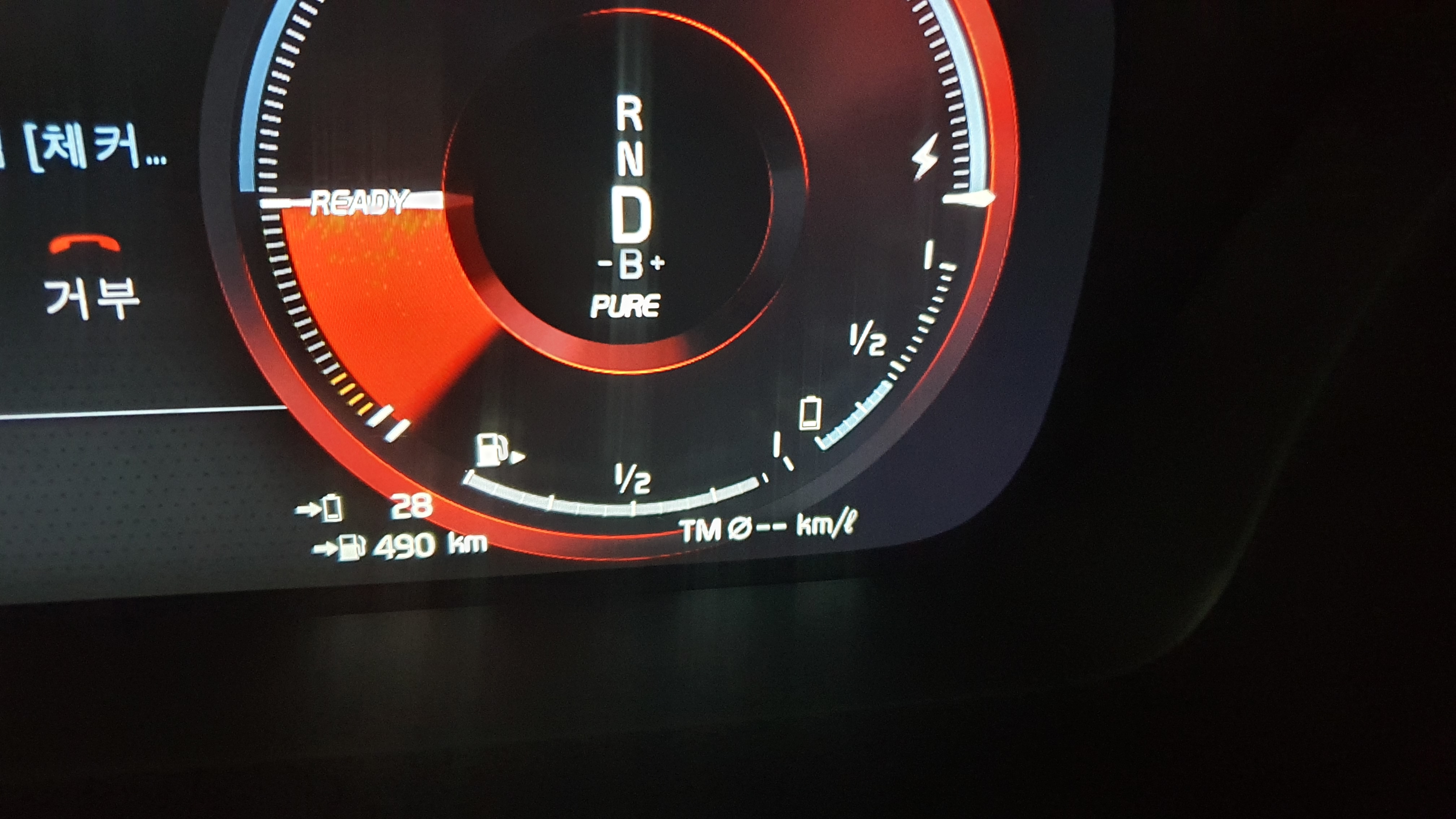 이번에는 퓨어 모드이다. 하이브리드 모드는 기본적으로 하이브리드 배터리 용량이 남아있다면 용량을 모두 사용하고 출력이 필요하면 전기모터를 능동적으로 사용하는 모드라면 퓨어 모드는 최대한 전기모터 위주로 구동을 하고 어쩔 수 없는 상황에서만 가솔린 엔진을 사용한다. 특히나 막히는 도로에서는 급 가속이 필요가 없기에 유류비 절감이나 가솔린 연료가 부족할 때 사용하면 좋다.