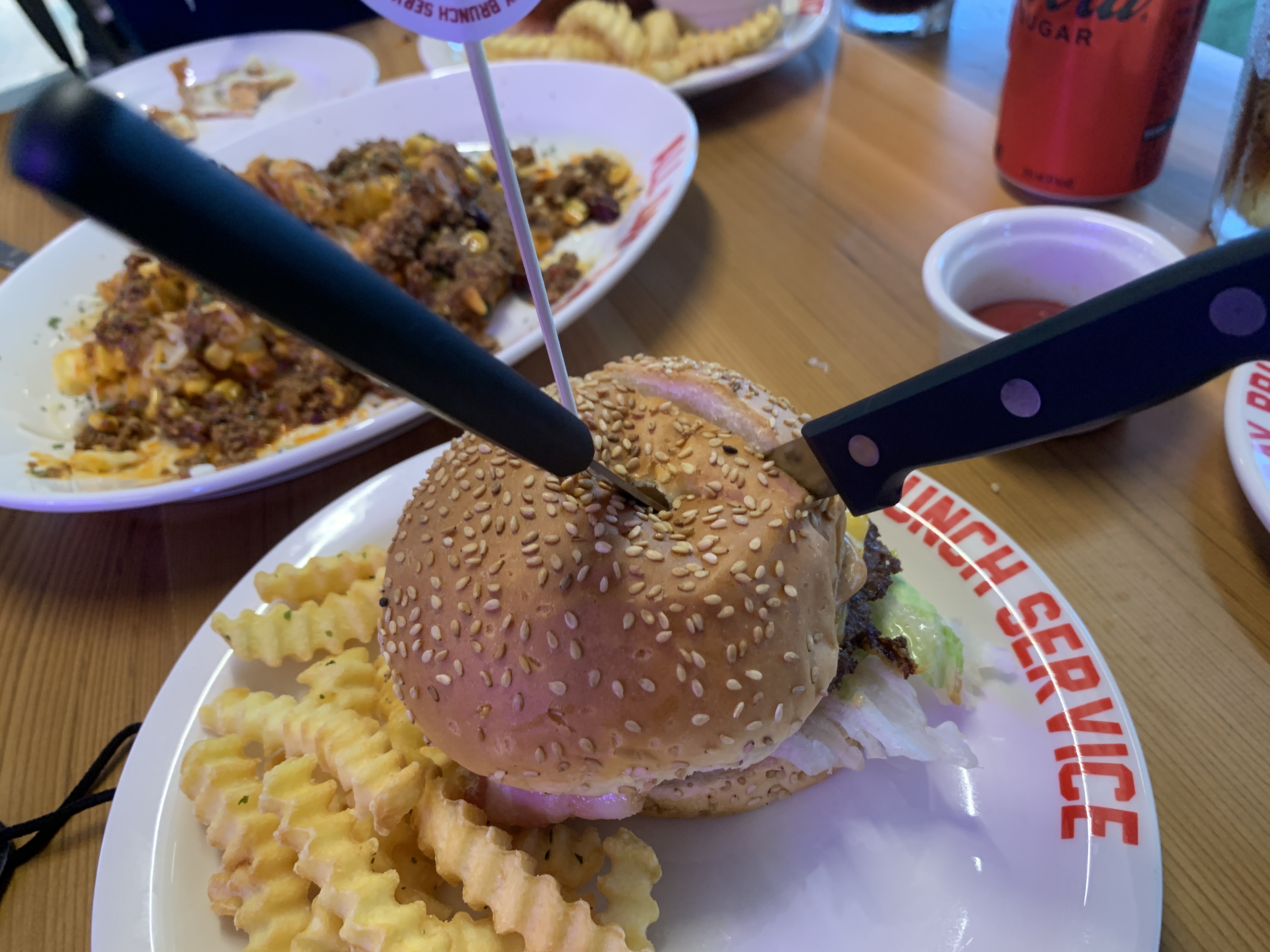 주문을 하면 테이블에는 알파벳 표지판을 나누어주는데 내가 주문한 메뉴를 직접 가져다 주는 서비스를 제공하고 있다. 믄료 또한 다양한 메뉴가 존재하는데 콜라도 일반 콜라 뿐만 아니라 제로콜라까지 판매한다. 첫 번째 나온 메뉴는 바로 칠리치즈프라이이다.