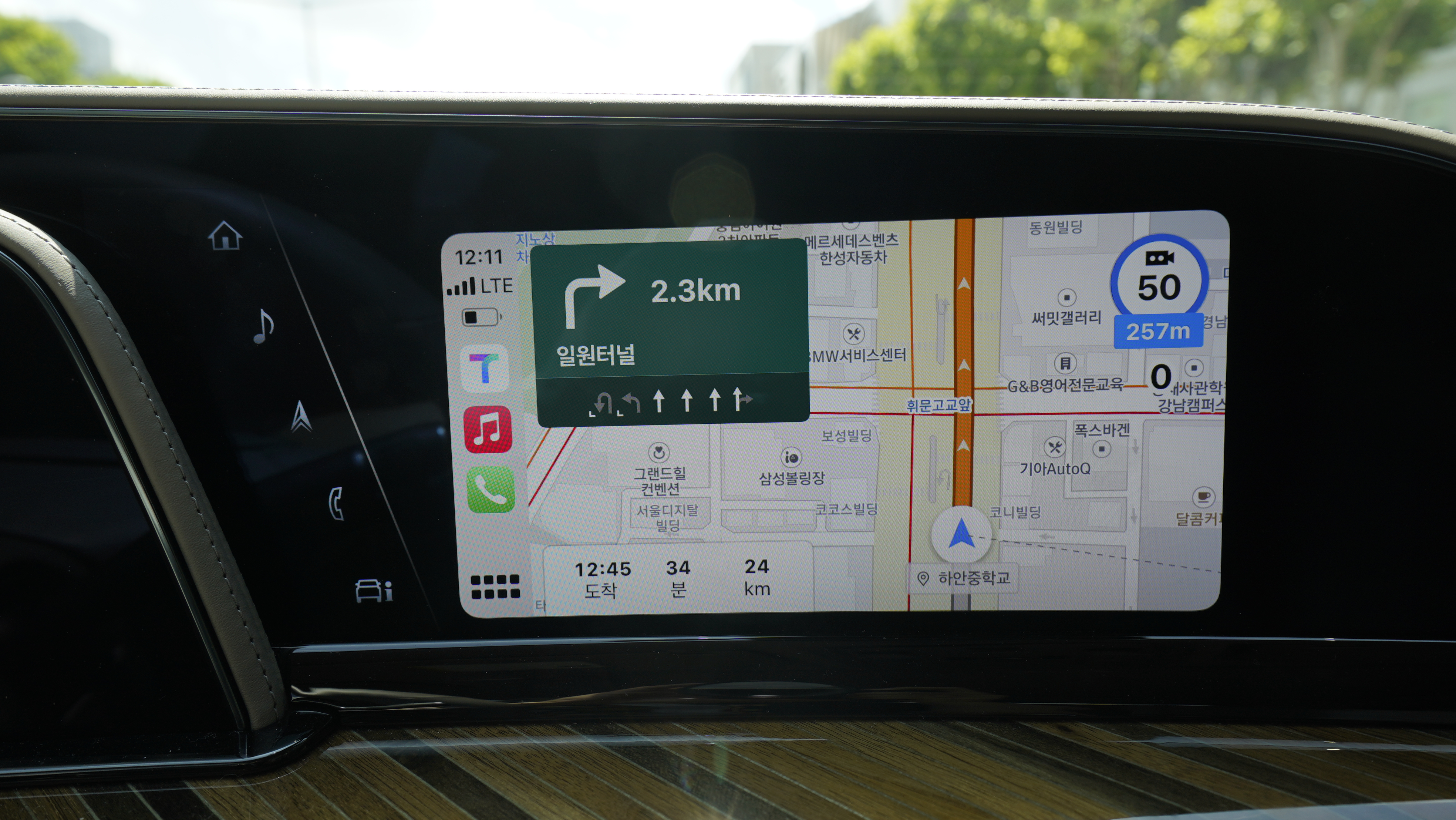 인포테인먼트 시스템은 무선 애플카플레이 / 안드로이드 오토를 지원하고 있다. 다만 아쉬운 점은 기본 GM 내비게이션을 사용하면 디스플레이를 가득 활용한 모습이지만 해상도 지원에 따라 애플 카플레이는 조금 잘리는 형태이다. 또한 38인치 디스플레이를 사용하고 있으면서도 공조기 버튼은 물리적으로 손쉽고 지고간적으로 적용하고 있어서 꽤나 만족스럽다.