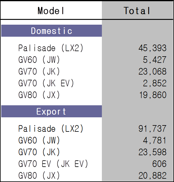 국내에서 펠리세이드 모델은 45,393대 / 해외 수출은 91,737대를 판매하고 있으며 GV80 모델은 19,860대가 판매되었고 수출은 20,882대가 되었다. 사실 내수 시장이 큰 브랜드이지만 생각보다 럭셔리 브랜드라고 하기에는 살짝 아쉬운 성적이 아닌가 싶은 수치를 보여준다.
