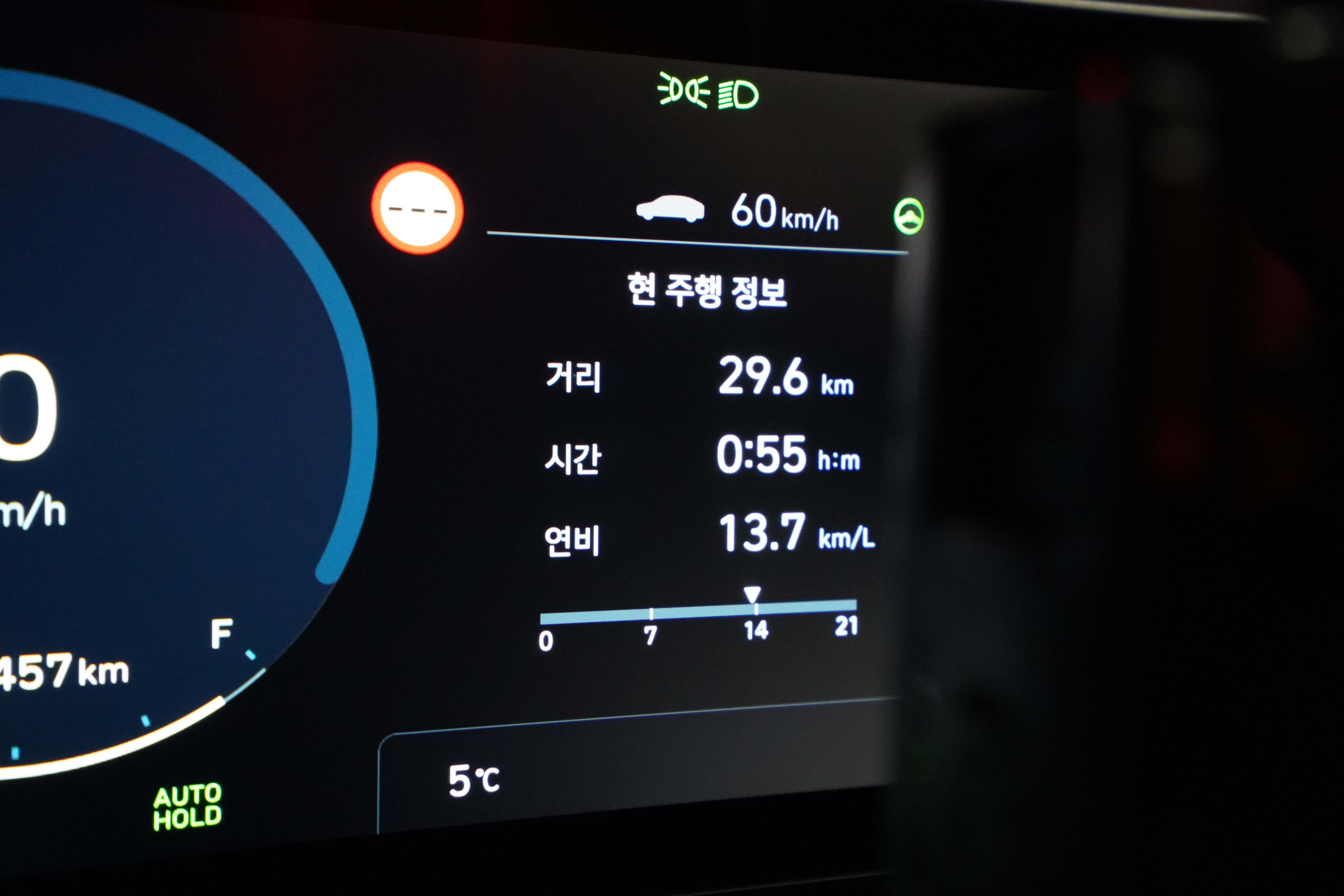 파주 출판단지에서 시속 90km/h 크루즈 컨트롤을 켜고 주행해본 결과 약 27km 주행에 20분 소요되어 연비 19.5km/L까지 보여준다는 것을 확인할 수 있었다. 사실 이 구간은 처음부터 끝까지 어댑티브 크루즈컨트롤로 시속 90km/h 로 꾸준히 달렸던 연비이기 때문에 실제 이 정도 연비까지는 보기는 힘들 수 있지만 이 차량의 최악의 연비와 최고의 연비 차이는 꽤 크다는 사실을 알 수 있다.