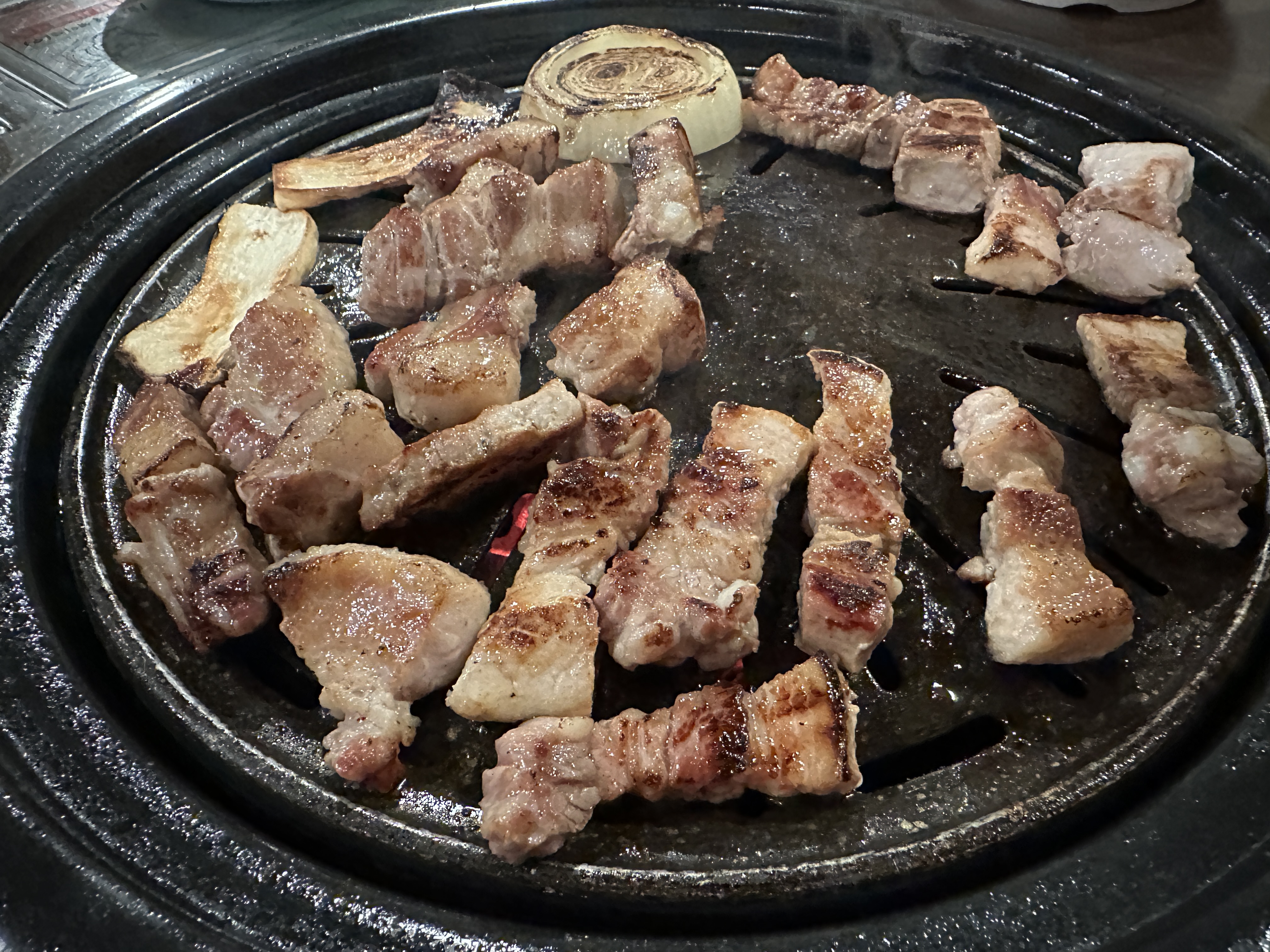삼겹살은 한돈 삼겹살을 사용하는 전체적으로 비계가 고루 있어서 익혔을 때 꽤 괜찮은 식감을 보여준다.