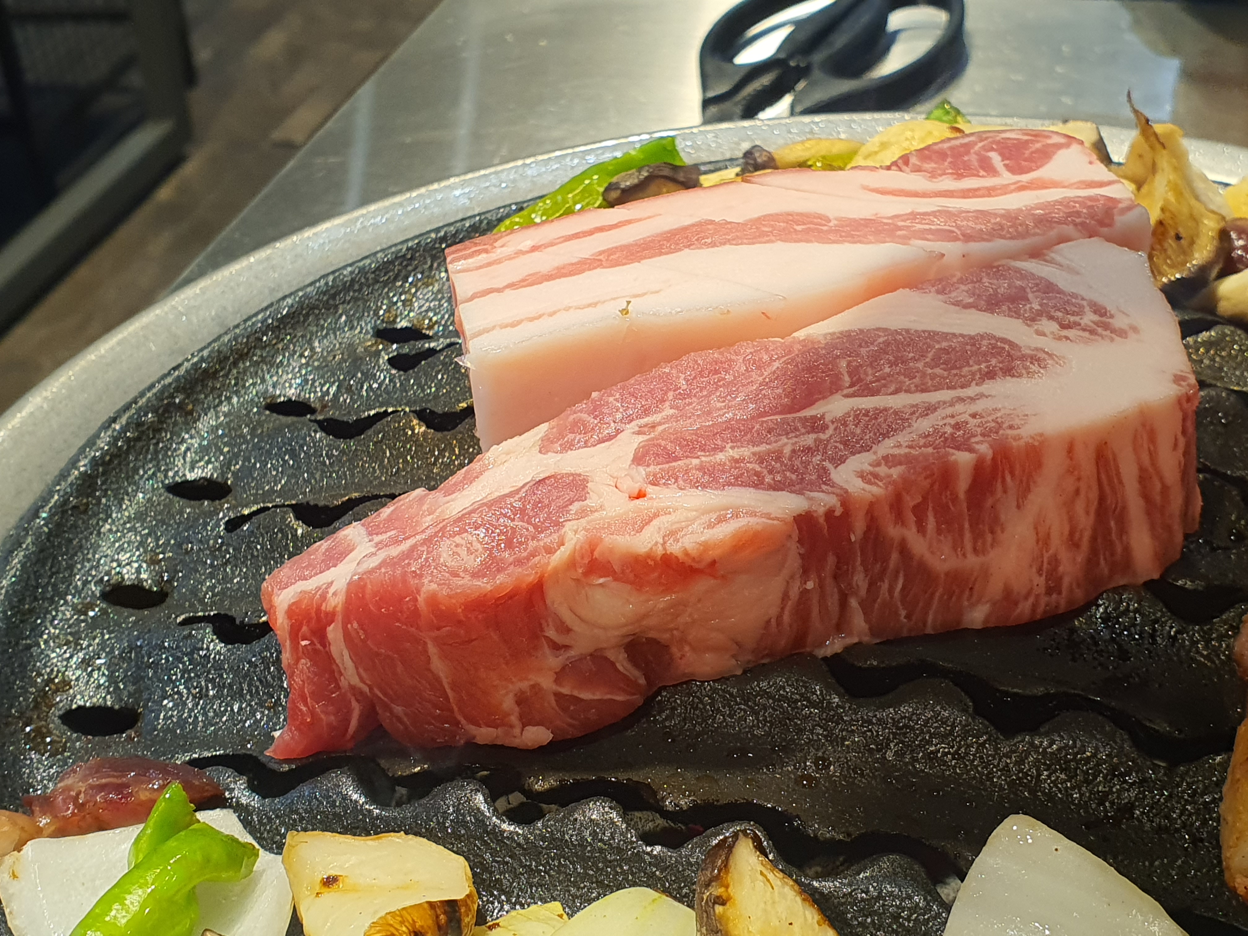 삼겹살을 뜨거울때 소금만 살짝 찍어먹어보면 겉바속촉으로 육즙이 꽤나 괜찮게 나오기에 고기 맛이 살아있은 것이 특징이다. 그냥 먹어도 좋지만 곁들임 메뉴들과 함께 먹으면 정말 맛있게 먹을 수가 있다.