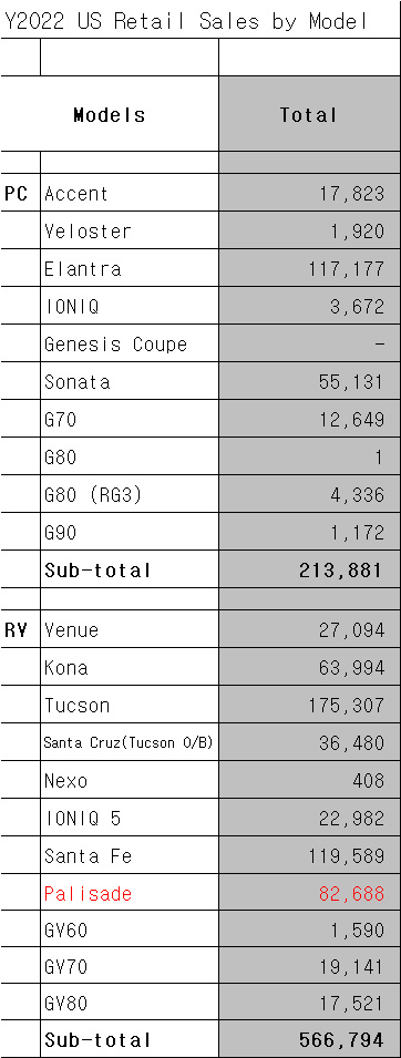 2022년 현대자동차 북미 판매량을 살펴보자. 북미 시장에서 가장 많이 판매된 현대자동차량은 바로 투싼 모델로 175,307대이며 그 다음으로는 엘란트라(아반테 수출명) 모델로 117,177대 / 싼타페 119,589대 그 다음 4번째로 많이 판매된 모델이 바로 팰리세이드 82,688대이다. 사실 이렇게 반문할 수도 있다. 땅덩리도 큰데 SUV 주력 준대형 모델 중에서 너무 적은 숫자가 아니냐? 라고 말이다.