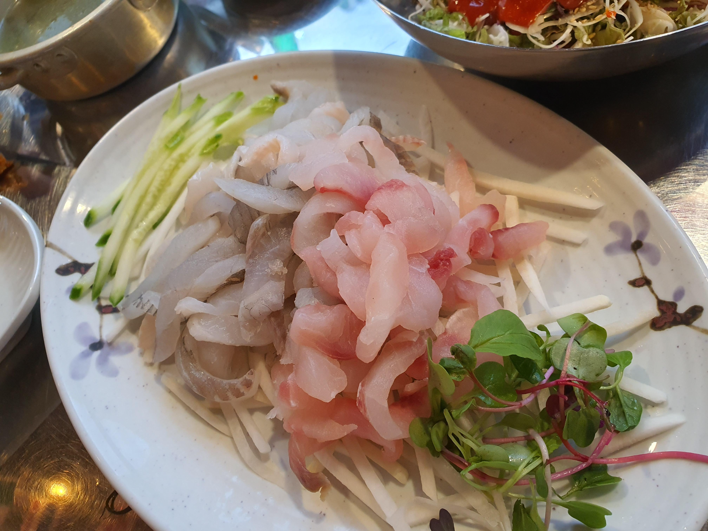 막회는 이렇게 야채와 함께 나오는데 회 한점 그리고 초장에 버무린 야채모음을 쌈에 싸먹으면 정말 맛이 좋고 평소 먹는 회 맛이 아닌 새로운 느낌으로 그냥 초장에 찍어먹는 회보다 훨씬 괜찮은 맛을 보여주고 있어서 또 찾고 싶은 그런 맛을 가진 구로디지털단지 횟집 중 하나가 되어버려 자주 찾는 곳이 되었다.