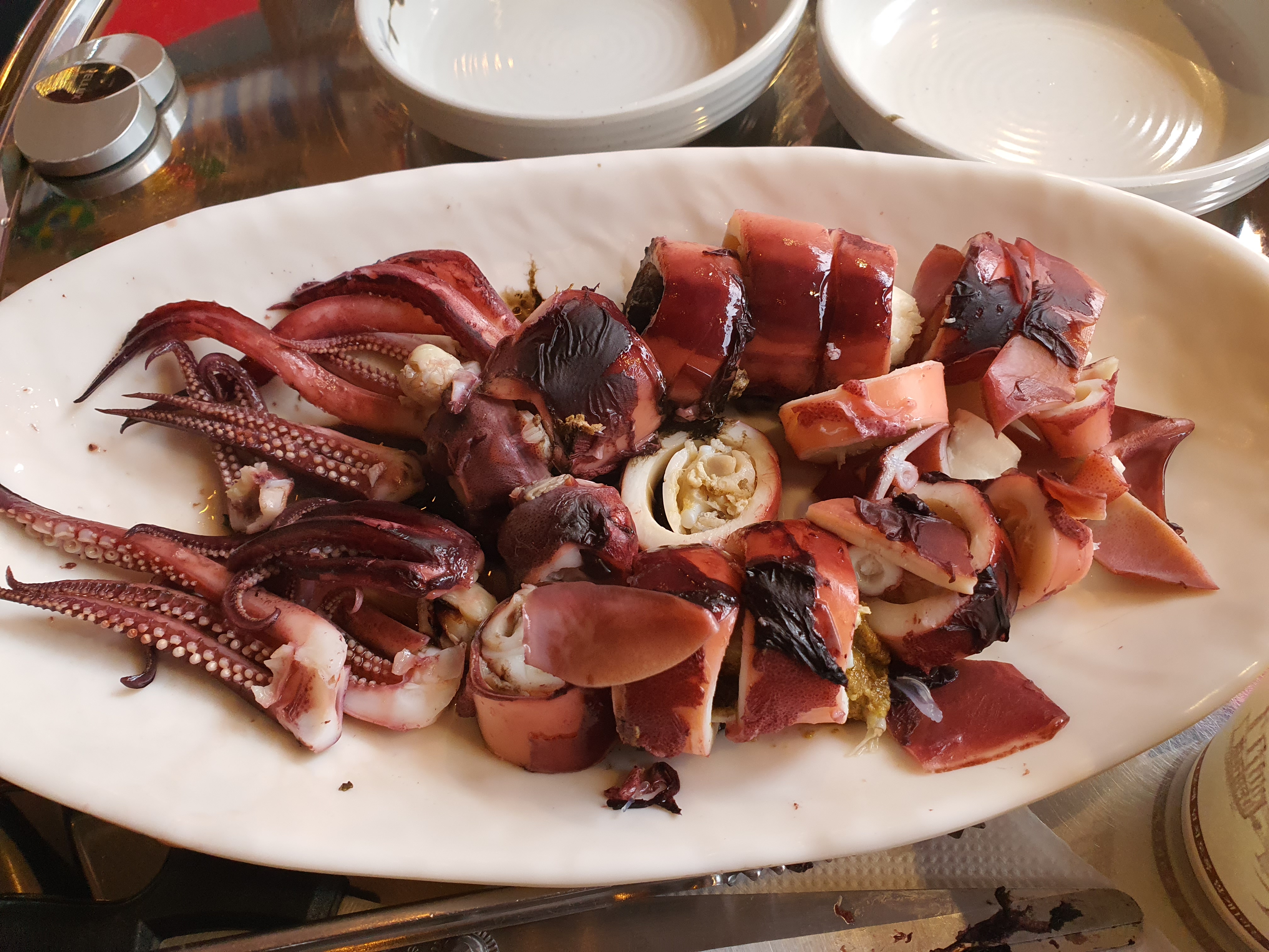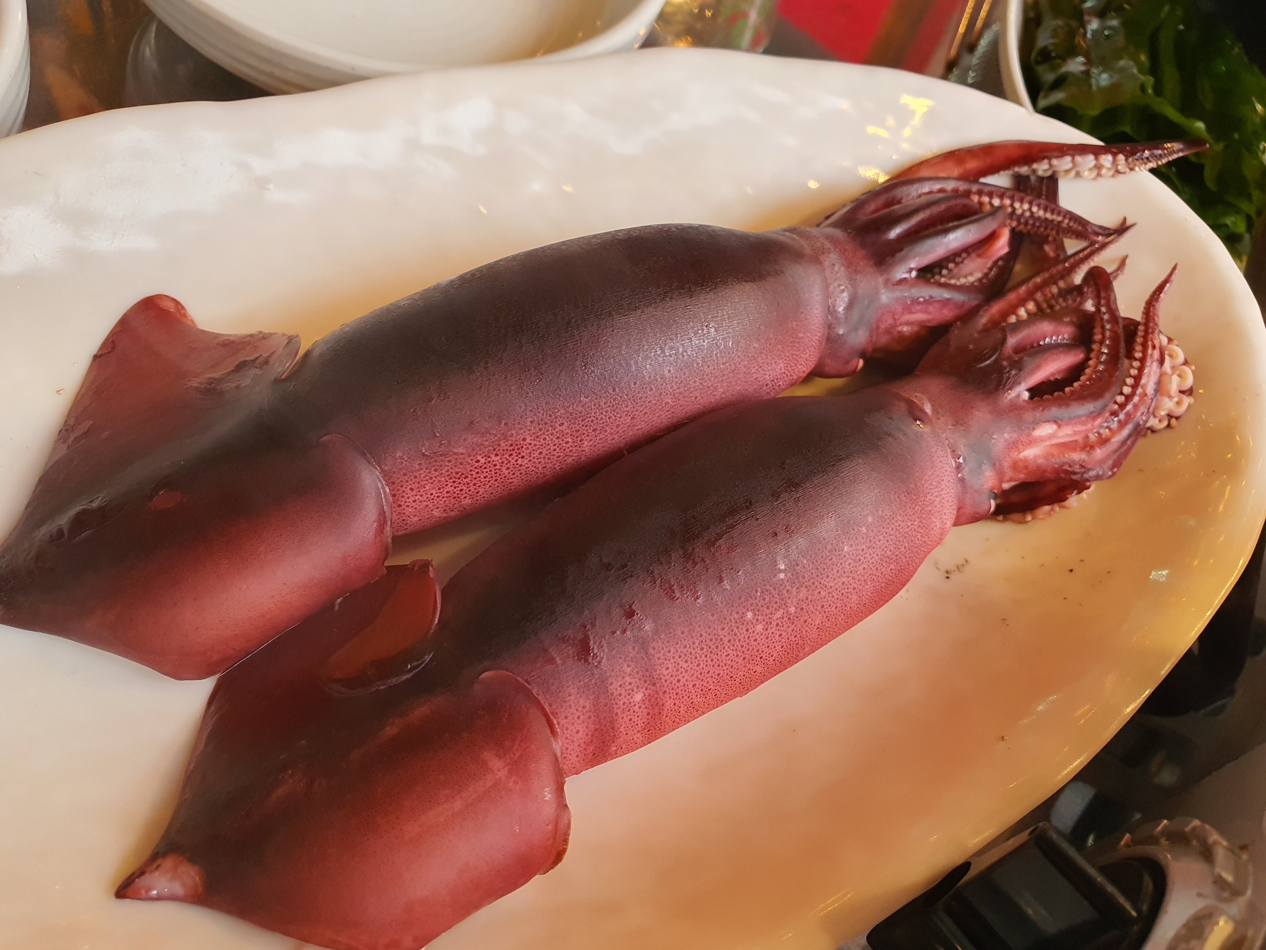 처음 주문한 음식은 통 오징어 찜이다. 사실 이렇게 통으로 찌는 형태는 강원도에서 주로 볼 수 있는 형태인데 직접 자르다보면 오징어에 내장 뿐만 아니라 먹물주머니까지 있어서 조심해서 짤라야한다. 하지만 맛은 정말 좋고 부드러운 식감이 소주를 부르는 맛으로 식사가 부족하다면 통 오징어찜 추천한다.