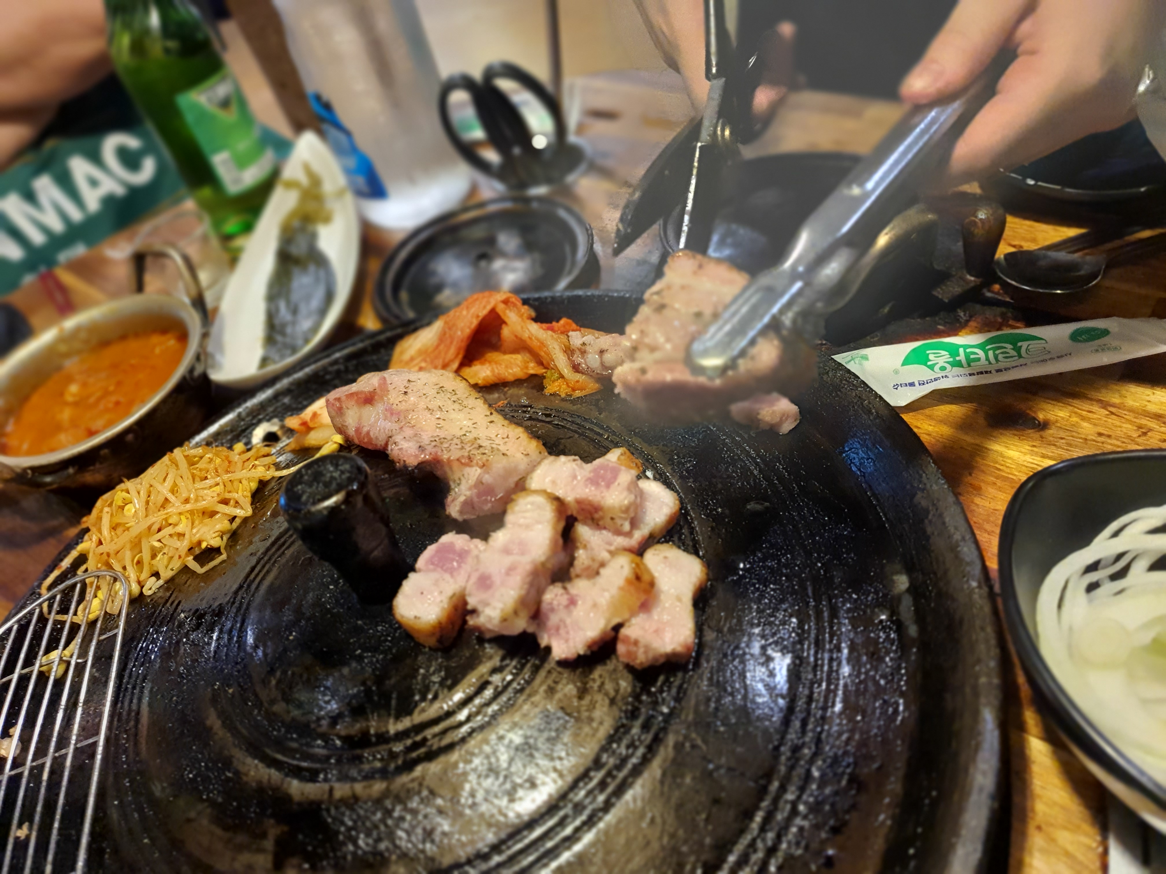 기름기가 어느정도 빠진 삼겹살은 확실히 우리집 주변에서 먹던 삼겹살과 다른 느낌을 준다. 이렇게 솥뚜껑 위에서 한 번 더 익혀주고 잘라주면 맛있는 삼겹살이 완성된다. 솥뚜껑에 장점을 잘 살려서 콩나물과 김치까지 익혀서 같이 먹으면 금상첨화이다.
