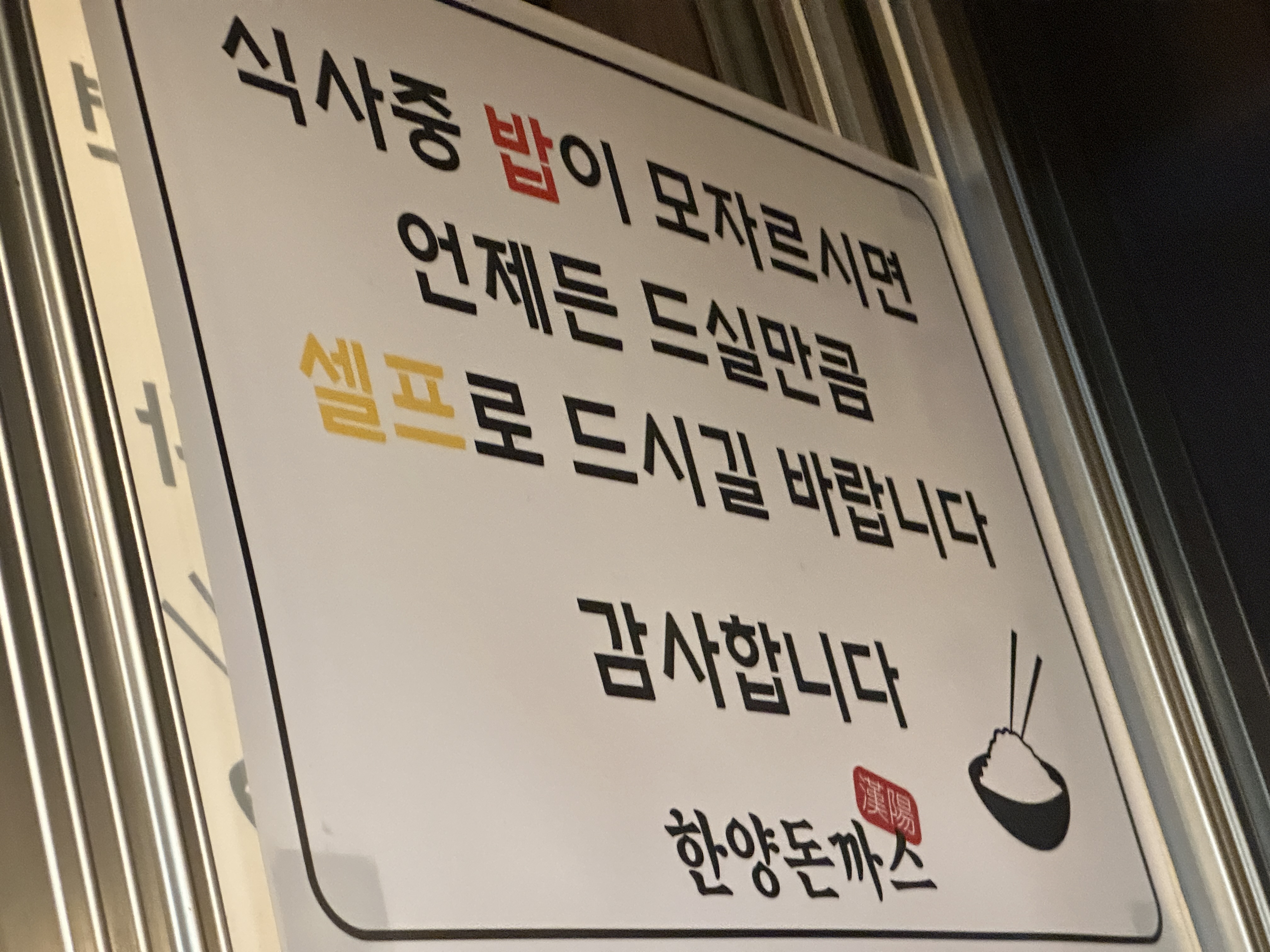 양재동 한양 돈까스에서는 돈까스 소스에 겨자를 섞어서 먹으면 더 맛있다고 하는데 이건 취향이니 알아서 드시면 좋고 돈까스를 먹으면서 덜 익은게 아니냐고 하는 분들 때문에 이런 이야기가 있는듯합니다. 식사 중 밥이 모자르시면 셀프로 얼마든지 먹을 수 있다는 말은 이 비싼 동네에서 점심식사로 줄서게하기 딱 좋은 곳입니다.