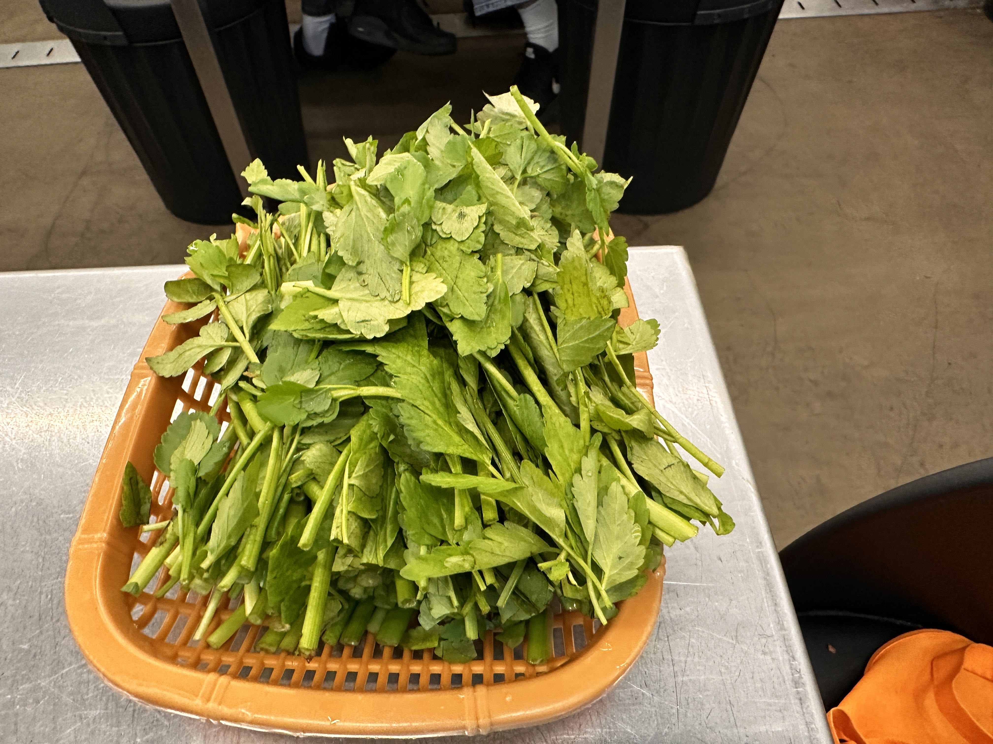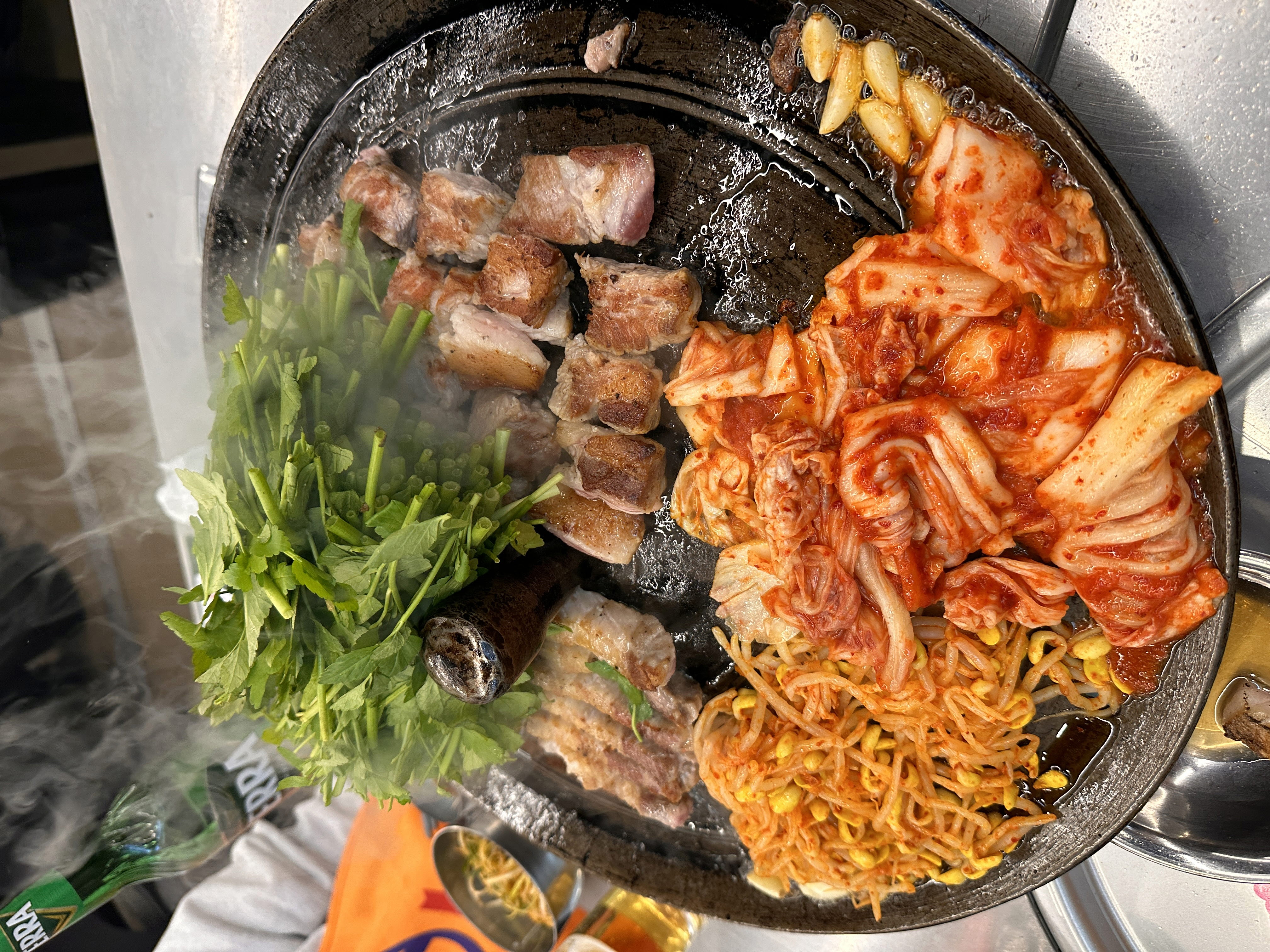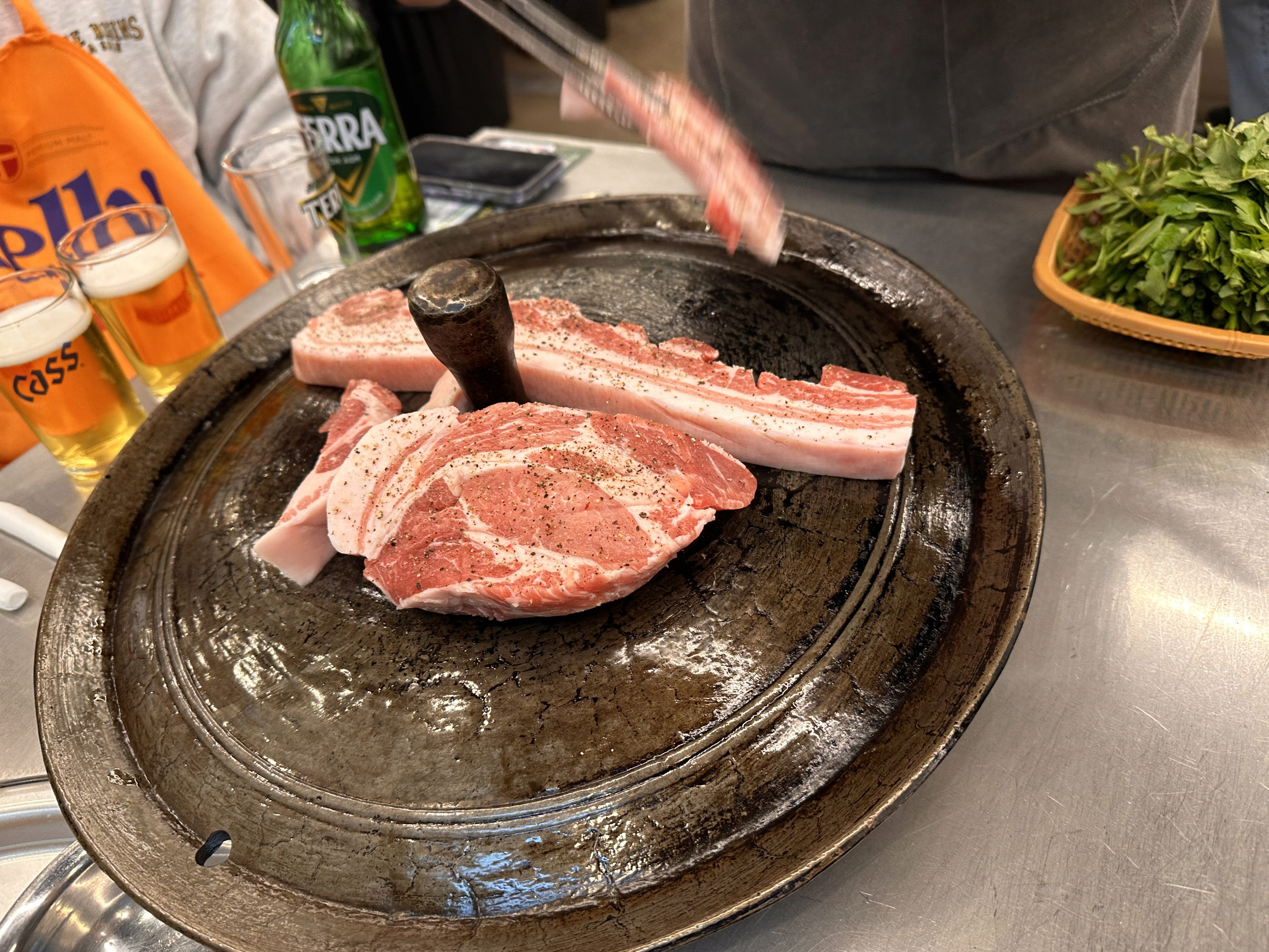 테이블에는 기본 찬들이 빈틈없이 차려집니다. 김치는 물론이고, 여러 종류의 샐러드와 조미료까지, 다양한 맛을 원하는 이들을 위한 고려가 돋보입니다. 그리고 여기에 추가로 주문할 수 있는 미나리는, 솥뚜껑 삼겹살과 함께 먹으면 그 맛이 일품이죠.