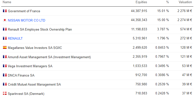 반면 르노 본사의 지분은 프랑스 정부가 15%로 가장 높고, 르노&닛산&미쓰비시 얼라이언스가 15%를 가지고 있다. 전체적으로 프랑스 내 회사들이 지분을 대부분 가지고 있으며, 지리자동차는 르노 본사에 영향이 없다. 하지만 르노코리아는 다르다.