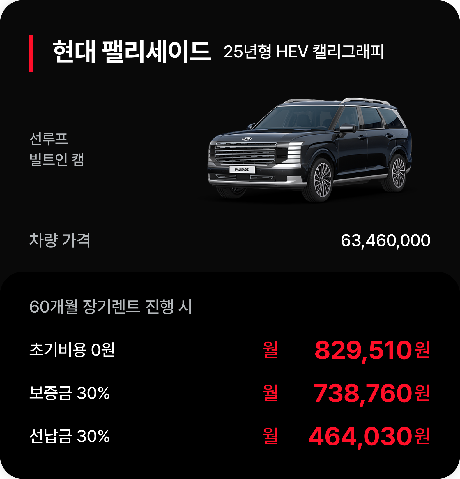 팰리세이드 장기렌트 (25년형 캘리그라피) 차량가: 63,460,000원 월 납입금(무보증): 829,510원