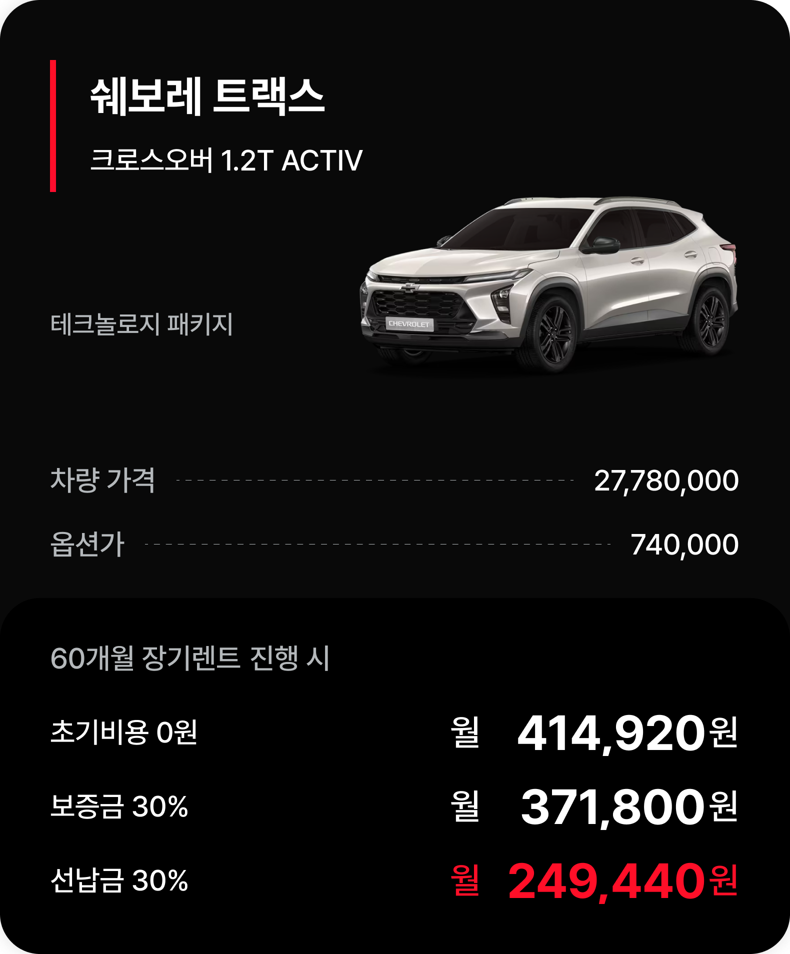 차량의 가치는 가격표와 만났을 때 비로소 증명된다. 트랙스 크로스오버의 상품성을 가장 효율적으로 누리는 방법은 무엇일까. 에이원오토를 통해 산출된 1.2T ACTIV 트림(차량가 2,778만 원, 옵션 74만 원 포함)의 견적을 분석해 보면 그 해답은 장기렌트로 귀결된다.