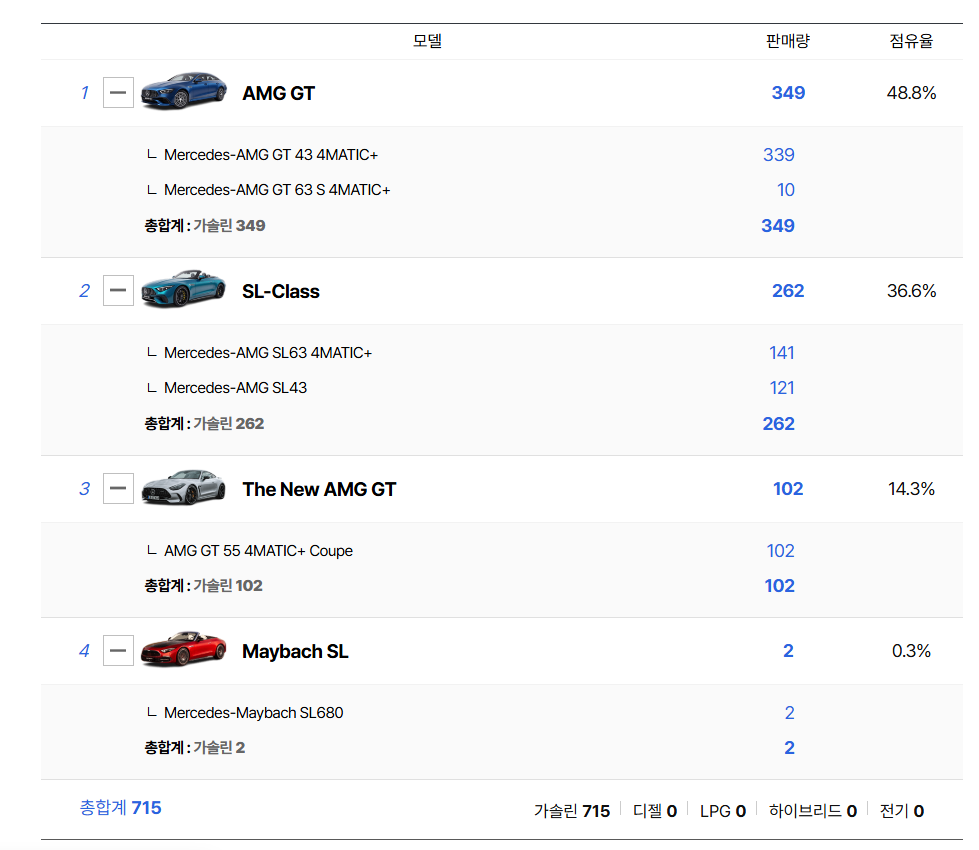 한국 시장에서 메르세데스 AMG 라인업의 위상은 독보적이다. 2025년 1월 판매 데이터를 살펴보면 AMG GT 모델은 단일 라인업으로 349대를 판매하며 48.8%라는 압도적인 점유율을 기록했다. 이는 벤츠 프로모션 정책이 시장에 미치는 영향력이 상당함을 입증한다.