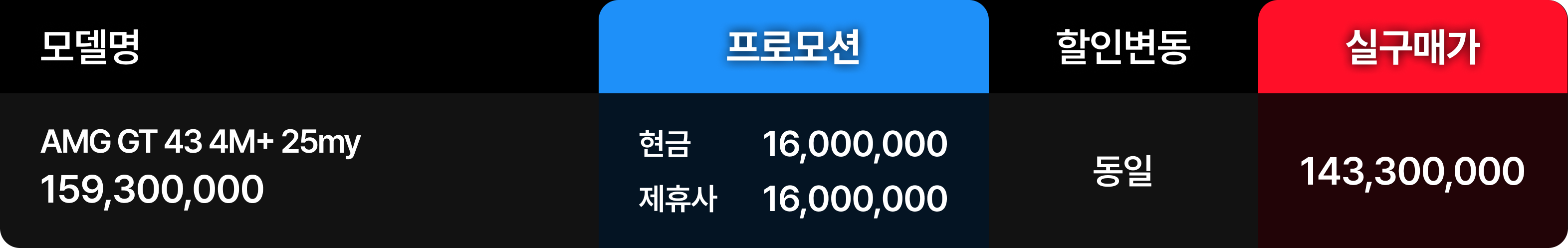세부 모델별 혜택을 분석해 본다. 먼저 벤츠 AMG GT 43 2025년식 모델의 경우 1,600만 원의 벤츠 할인 혜택이 지속되고 있다. 연식 변경 모델의 도입을 앞두고 기존 재고를 정리하기 위한 방어적 프로모션으로 판단되며 실구매 가격 경쟁력은 여전히 높다.