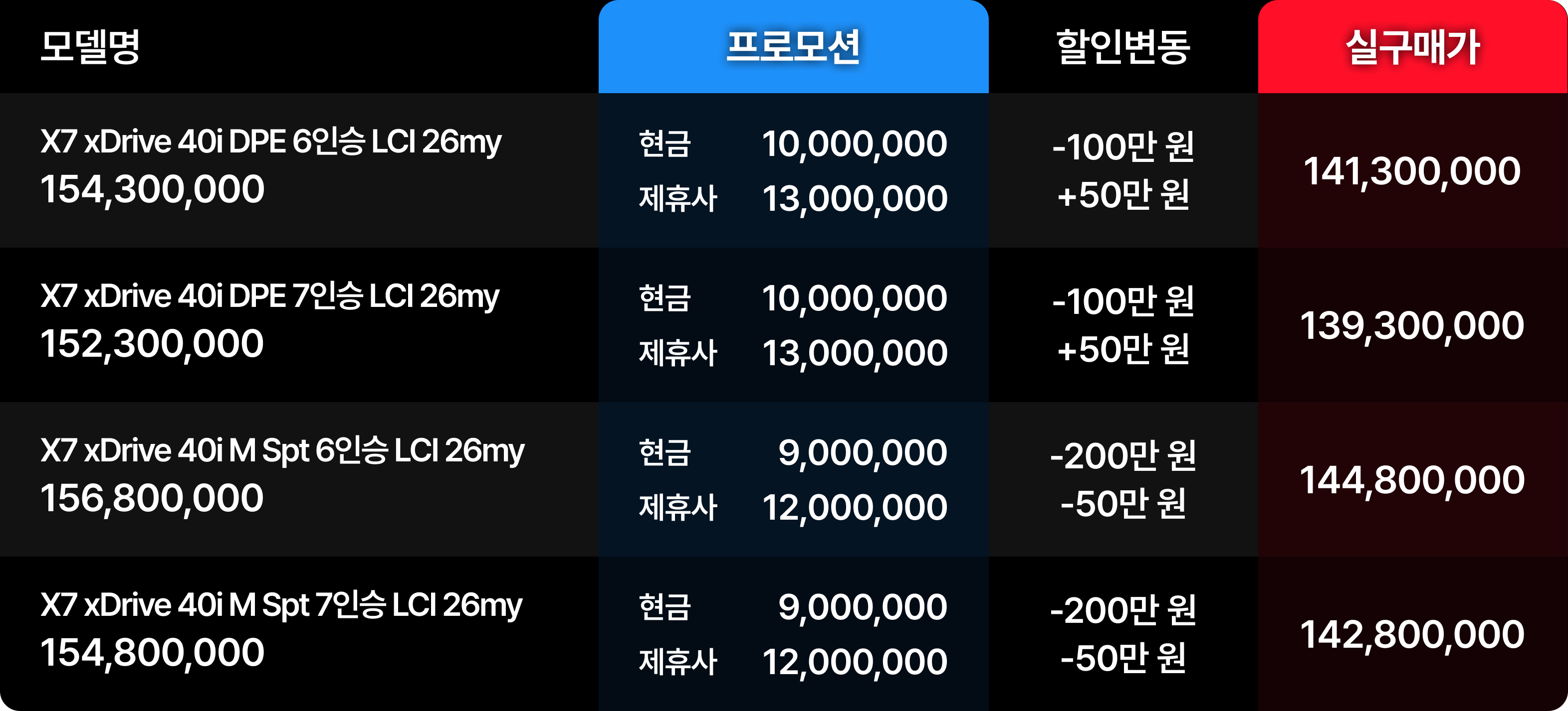 디젤 모델인 X7 40d 또한 현금 할인이 250만 원이나 대폭 삭감되었다. 40d DPE 7인승 실구매가는 1억 4,130만 원이다. 2025년 폭발적이었던 수요와 재고 부족이 겹치며 프로모션이 축소된 것으로 분석되나 플래그십으로서의 가치는 여전히 견고하다.