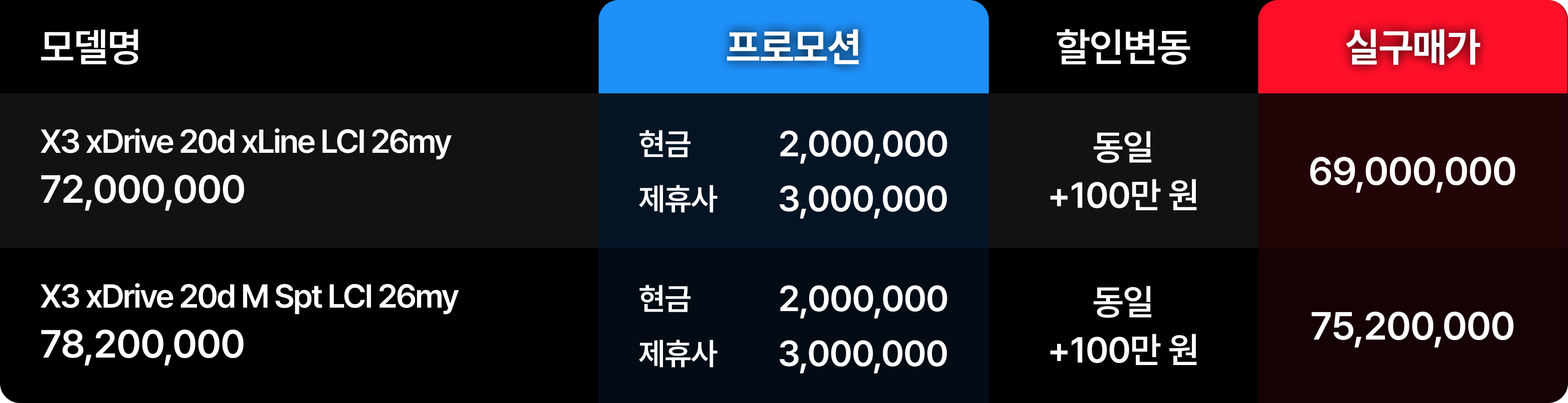 디젤 모델인 X3 20d 역시 제휴사 할인액이 100만 원 상승하며 최대 300만 원의 혜택을 제공한다. X3의 완성도 높은 섀시와 드라이빙 다이내믹스는 여전히 시장에서 독보적인 가치를 인정받고 있다. 20d xLine 모델 기준 실구매가 6,900만 원은 동급 경쟁 차량 대비 가격 경쟁력이 매우 뛰어나다.