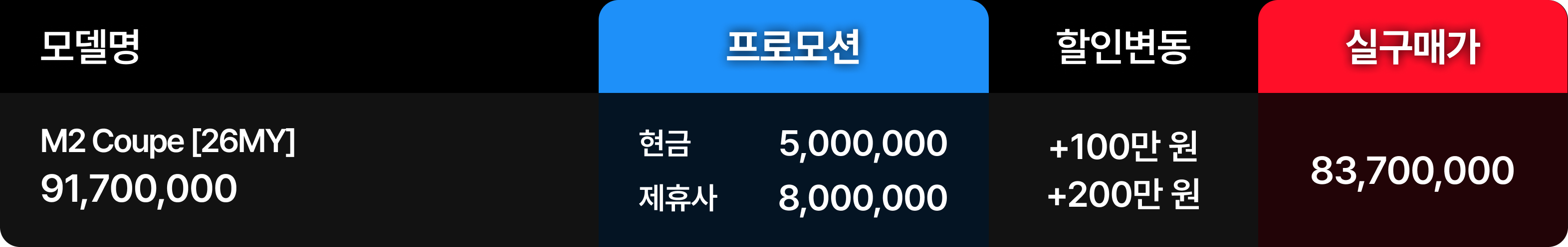 엔트리 모델임에도 정통 후륜 구동의 재미를 극대화한 BMW M2 쿠페는 2026년식으로 접어들며 시장 지배력을 공고히 하고 있다. 1월 프로모션 데이터를 살펴보면 제휴사 기준 800만 원의 할인이 책정되었는데 이는 전월 대비 무려 200만 원이 상향 조정된 수치다. 현금 구매 역시 100만 원 증가한 500만 원의 혜택을 제공한다. 9,170만 원이라는 출고가 대비 약 8.7%에 달하는 할인율은 이 세그먼트에서 보기 드문 수치이며 이는 경쟁사 신모델 출시에 대비한 선제적 조치로 풀이된다.
