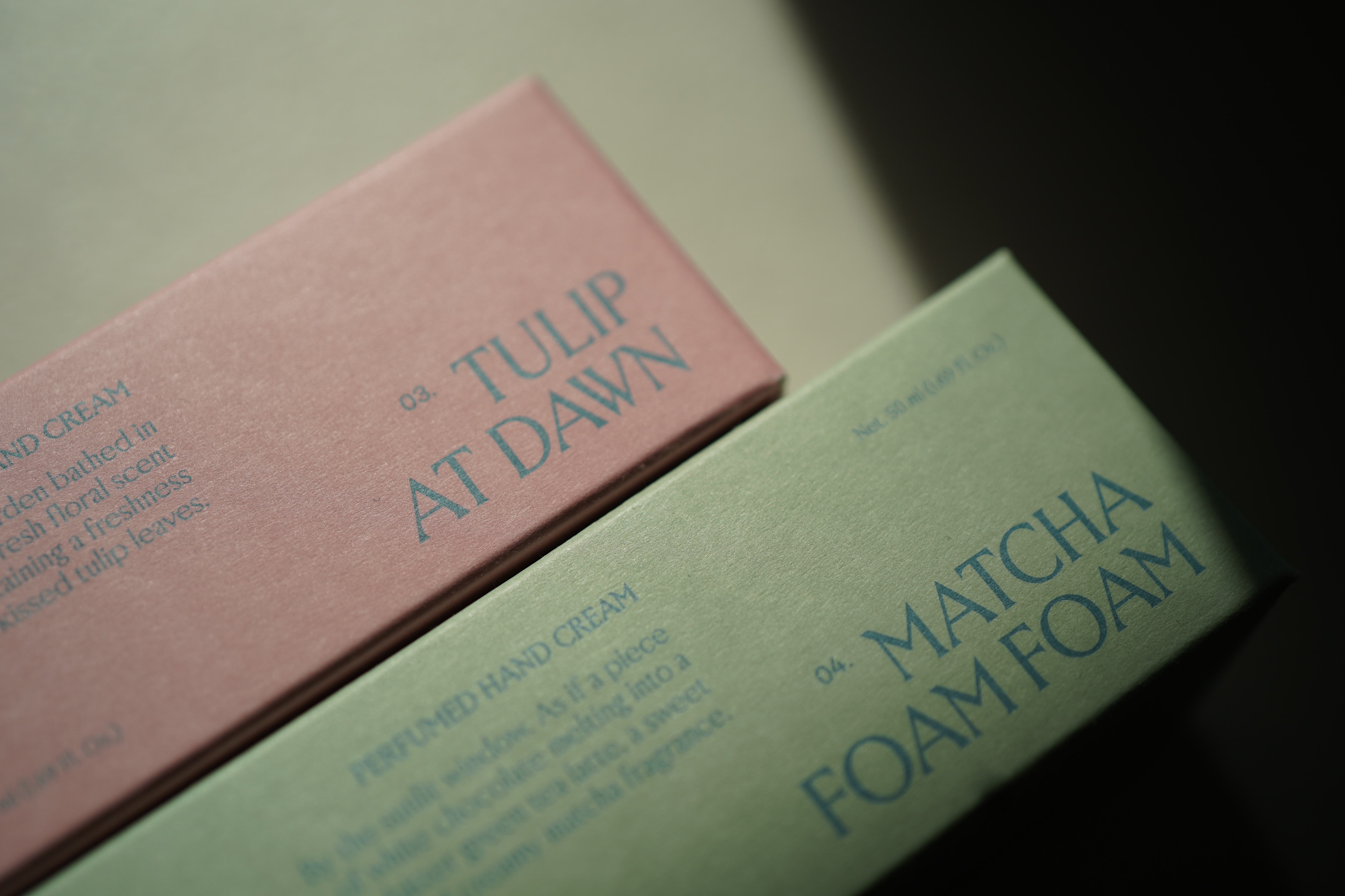 브랜드가 제안하는 4가지 시그니처 향 중 튤립 엣 던은 생화의 싱그러움을 극대화한 프레쉬 플로럴 계열이다 새벽 이슬을 머금은 튤립의 생생한 느낌을 구현하기 위해 풀잎의 향취를 정교하게 레이어링했다 반면 마차 폼폼은 쌉싸름한 말차 라떼와 화이트 초콜릿의 부드러움을 결합하여 크리미한 미각적 자극을 후각화했다 두 제품 모두 인위적인 알코올 향이 아닌 원료 본연의 깊이를 강조한 발향 구조를 지니고 있다