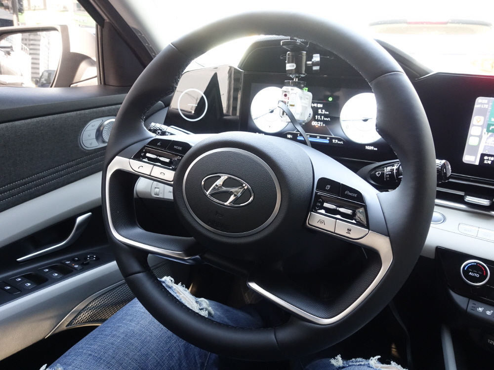 아반떼를 보면 조금은 특이한 부분이 있다. 바로 기어 노브인데 최근 출시된 현대자동차를 살펴보면 버튼으로 기어를 변속하는 방식을 가지고 있는데 현대 아반떼 7세대 모델에는 여전히 기어 노브를 적용했다. 이 점은 쏘나타와 팰리세이드 같은 차량과 다르게 기본 사양이 수동 변속기가 적용되며 차후에는 고성능 모델인 아반떼 N이 나온다면 수동 변속기를 적용하기 위함으로 보여진다. 스티어링 휠은 쏘나타와 비교했을 때 좀 더 스포티한 느낌을 주고 있지만 감성적이라도 D컷 스티어링 휠을 적용했다면 하는 아쉬움은 있다.