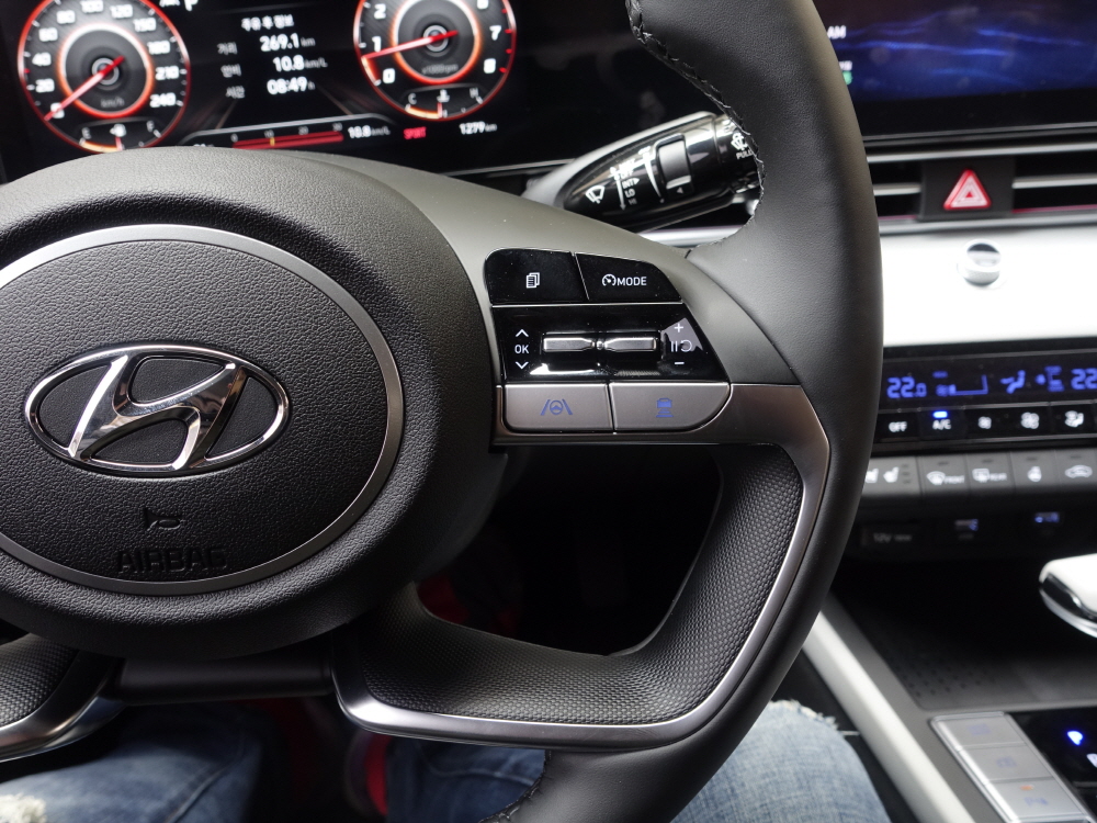 아반떼 신형 7세대 모델의 스티어링 휠은 스포티한 디자인을 가지고 있지만 패들 쉬프트가 적용되어 있지 않고 기본적인 버튼 기능만 적용되어 있다. 하지만 N-LINE 부터는 패들 쉬프트가 적용될 것으로 예상되며 고성능 N 모델에는 기존 밸로스터 N과 동일한 스티어링 오른쪽에 버튼이 새롭게 적용될 것으로 예상되고 있다. 여기에 스티어링 어딘가에 N 뱃지와 그립 가죽 소재의 변화로 노멀모델과 확실한 차별성을 두지 않을까? 예상된다.